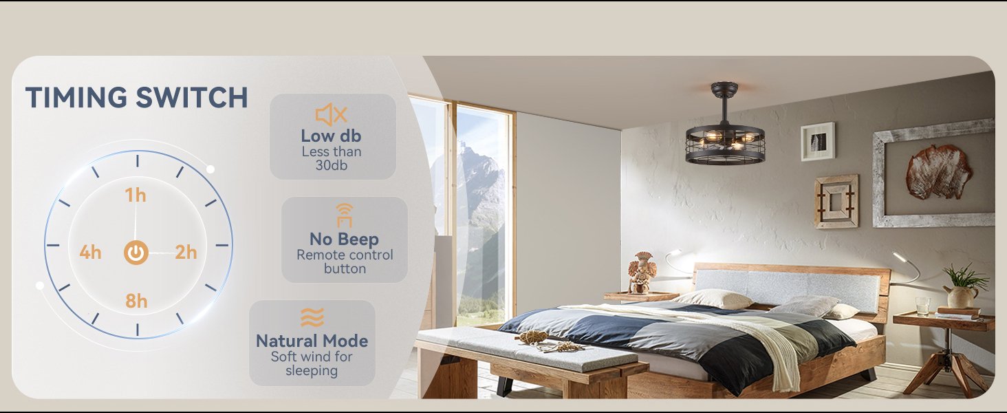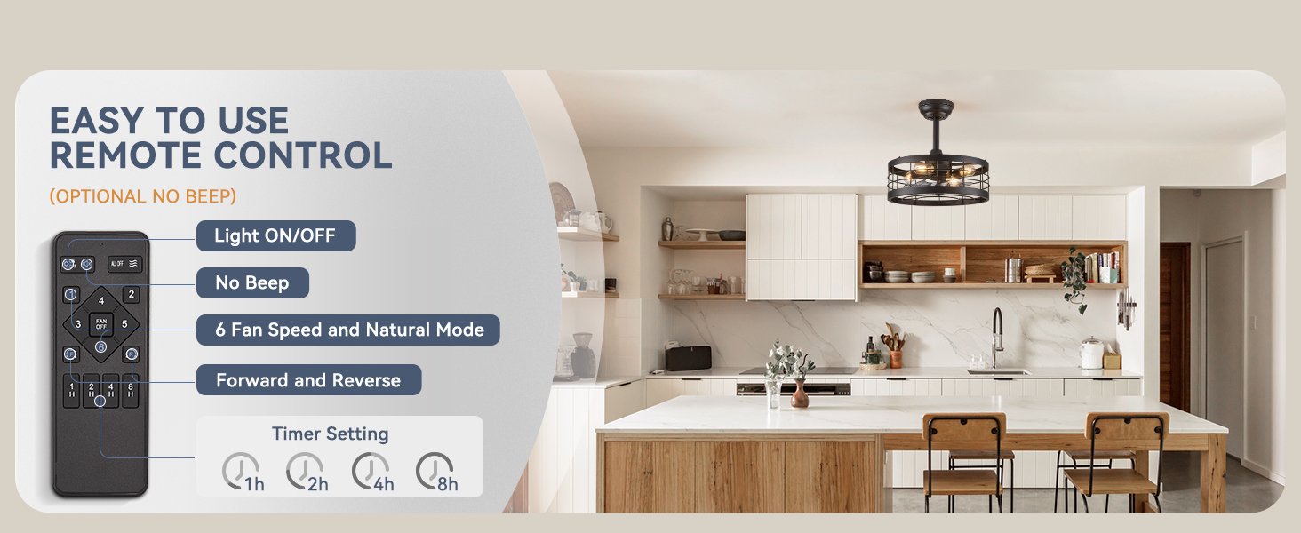 · REMOTE CONTROL: The remote control can be used for light and fan switching, wind speed adjustment, timing, reversible, etc. What’s more, at the request of buyers, we set the button to eliminate the beeping sound