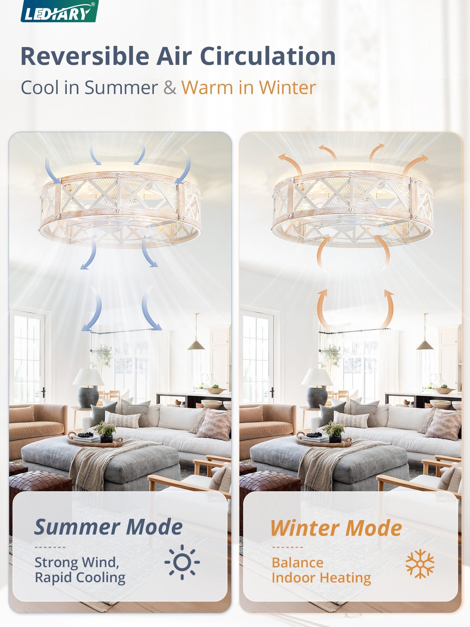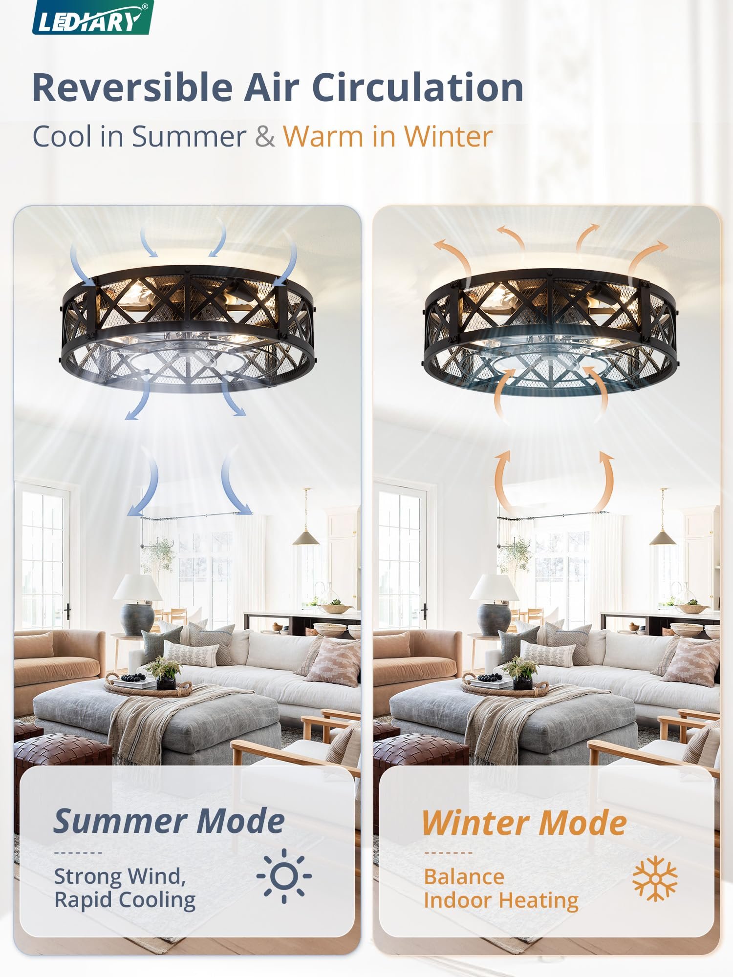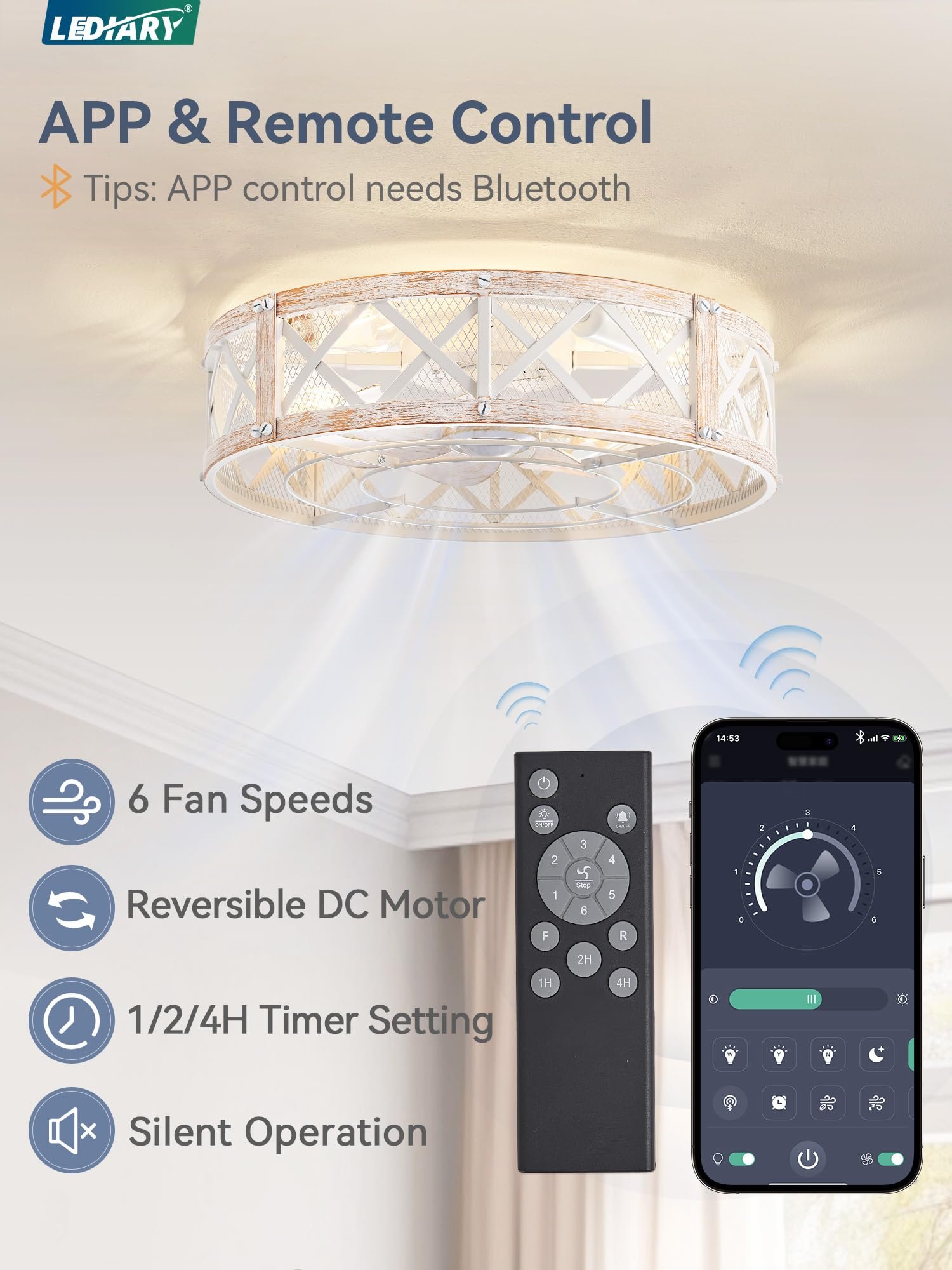 · 【Dual Smart Control】The farmhouse caged ceiling fan offers both APP and remote control options for effortless operation from a distance. The 6-speed settings cater to various scenarios, while the 1/2/4-hour timer allows you to set the auto-off function without leaving your seat, the fan or lighting can be turned on independently. Maintain ideal comfort with ease.