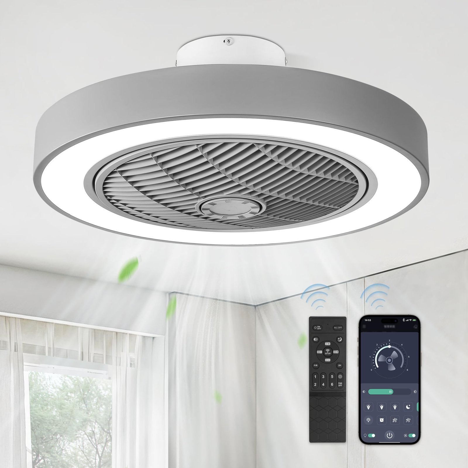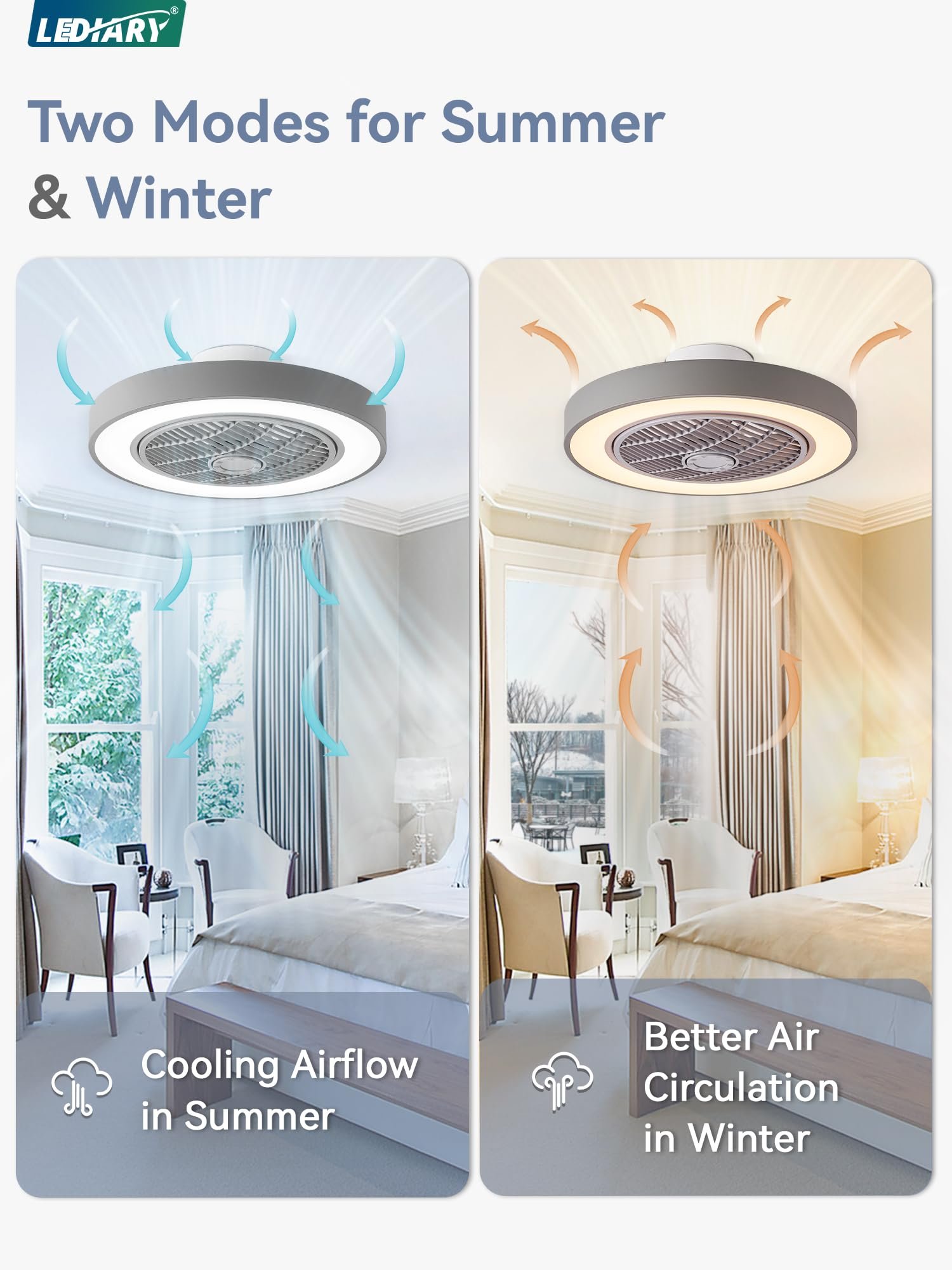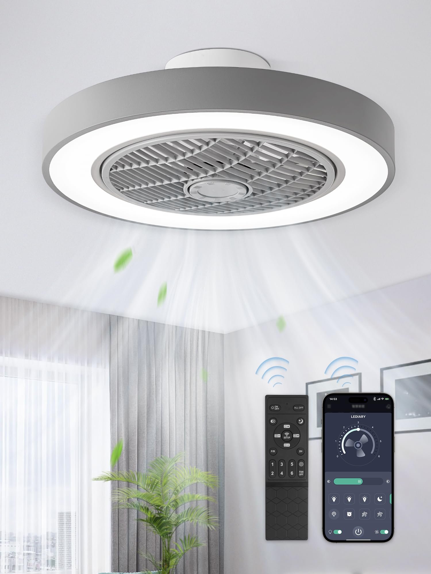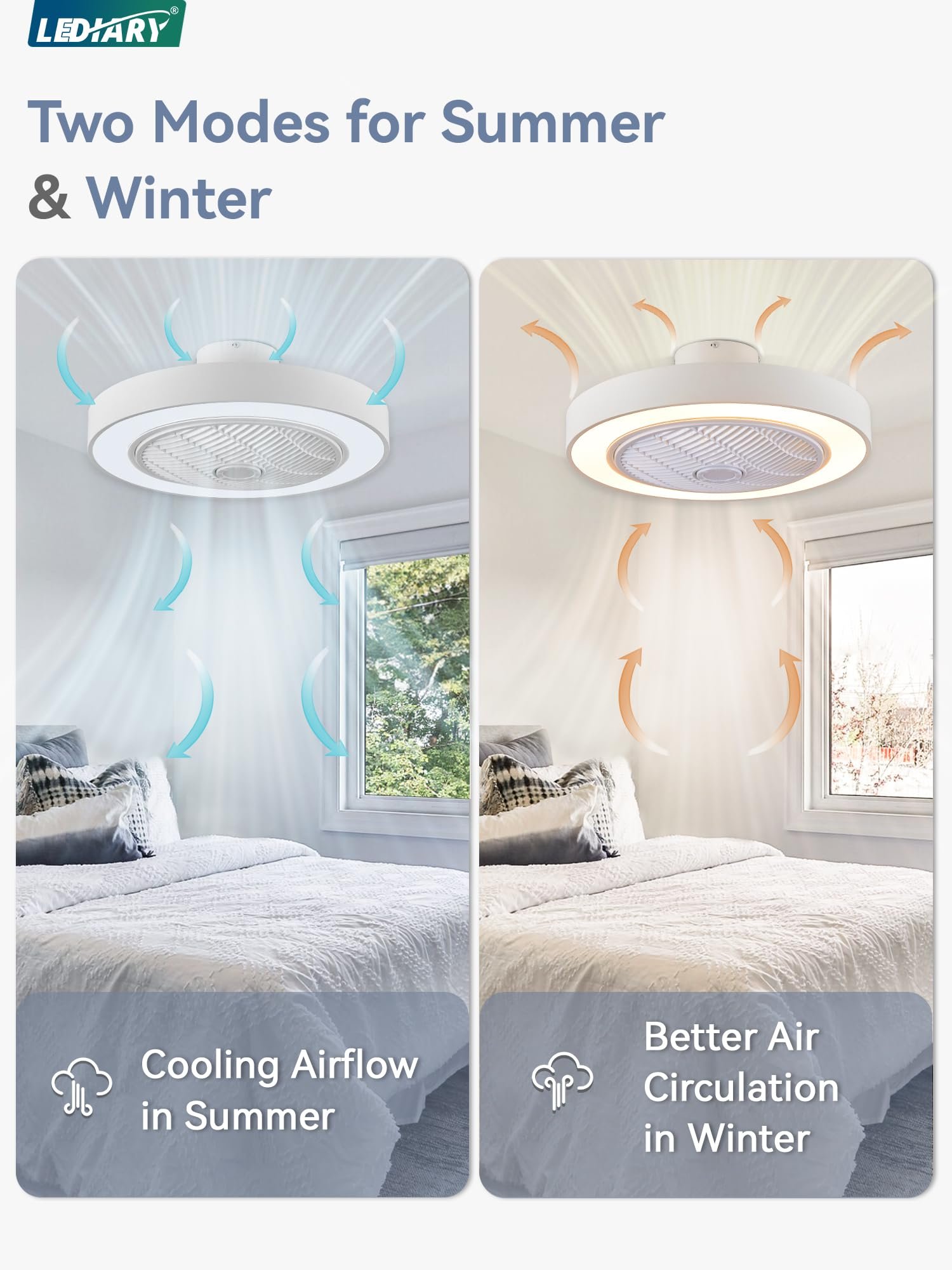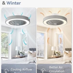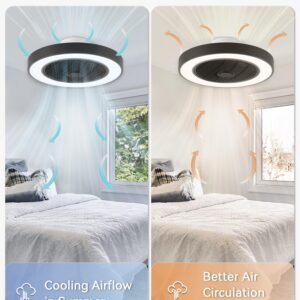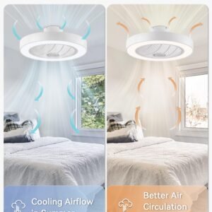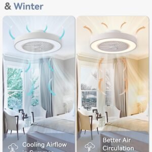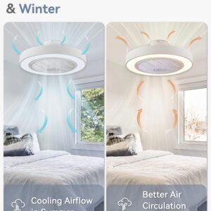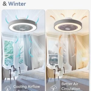 · REMOTE & APP CONTROL: Bladeless led ceiling fan with light through the intelligent remote control (FCC certification) & APP control color temperature (3000-6000K), brightness (0-100%) and achieve forward and reverse function, summer cool, winter circulation of warm air, there is no inability to connect the situation. The flush mount ceiling fan with lights has a memory function, when using the remote control to close and open again color temperature brightness remains unchanged