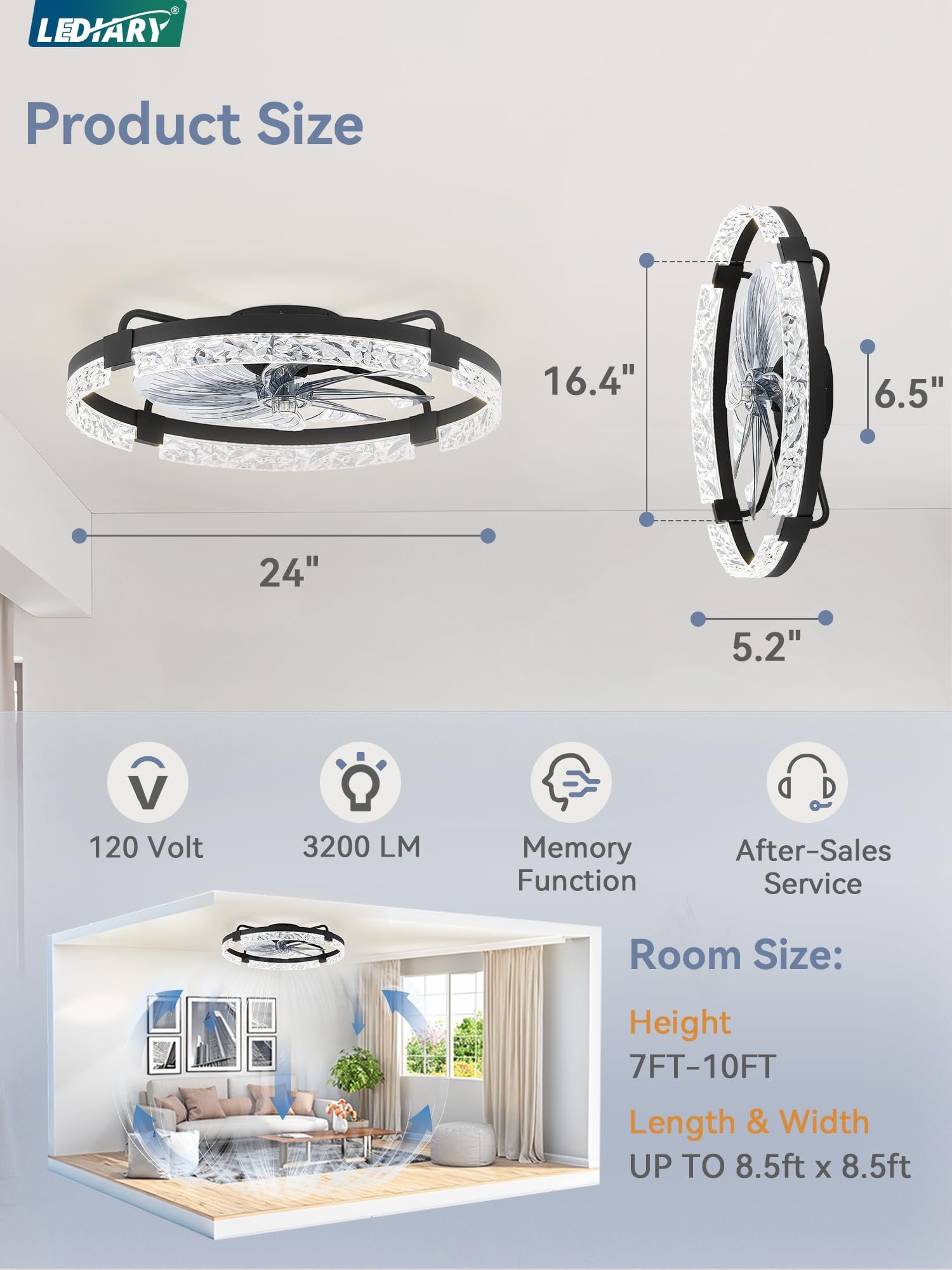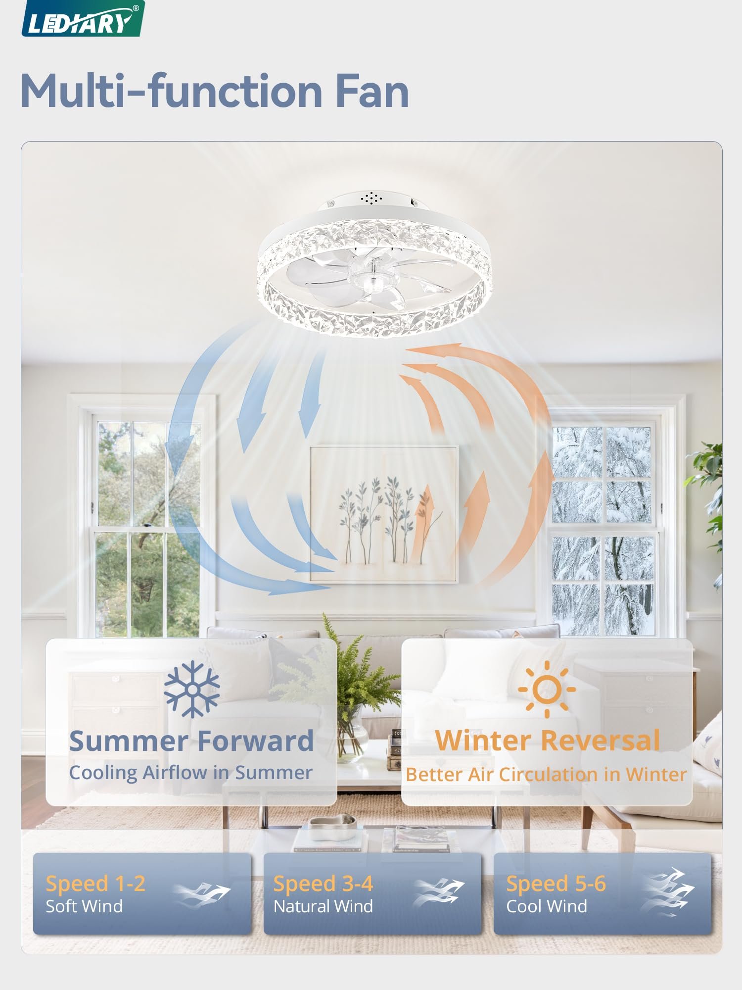 · Specification: Remote Control, 7 Blades, 2500 Lumens, 120 Voltage Output, Reversible Motor, 1/2H Timer Setting, 6 Speeds Fan, 3000K-6000K Color Temperature Selectable, 10%-100% Smooth Dimming