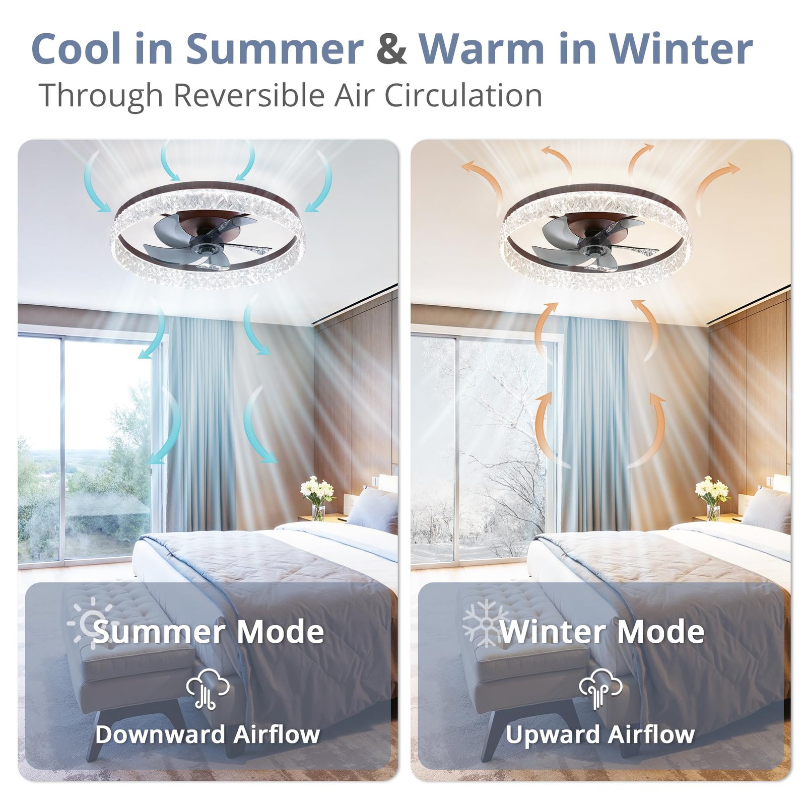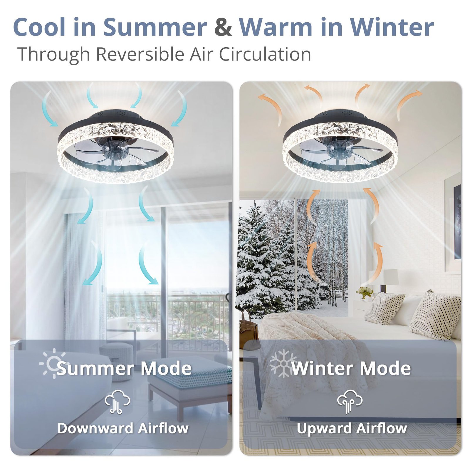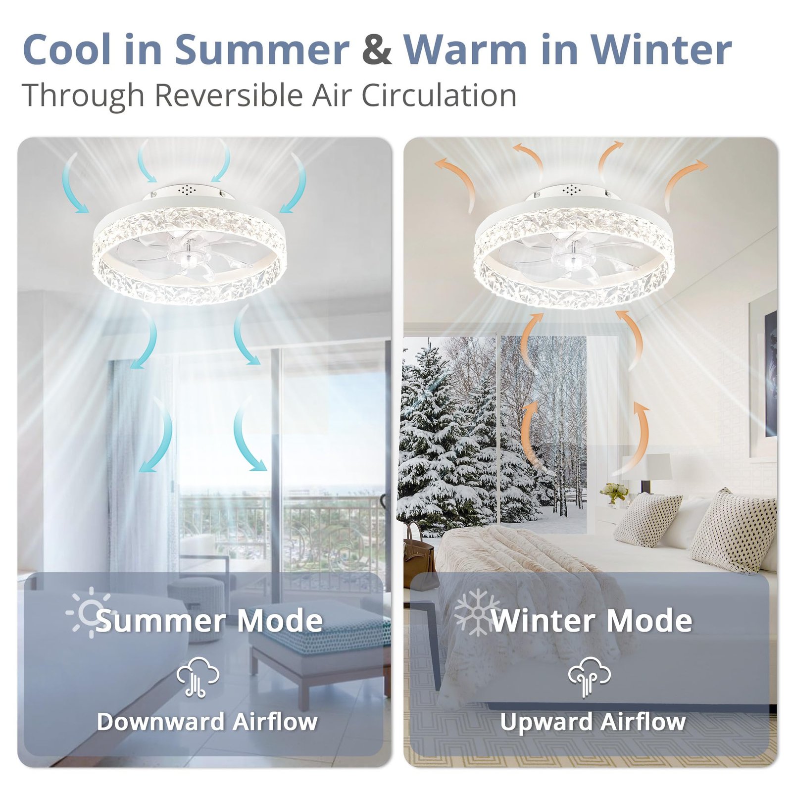 · Reversible Motor And Quiet Fan: Our white ceiling fan provides 2 airflow modes: It runs downdraft cool airflow during summer and updraft airflow during winter to aid in rotating warm air, promoting air circulation and saving energy.The pure copper motor runs smoothly, provides strong wind power, and low noise design creates a comfortable living environment, and improves the quality of sleep