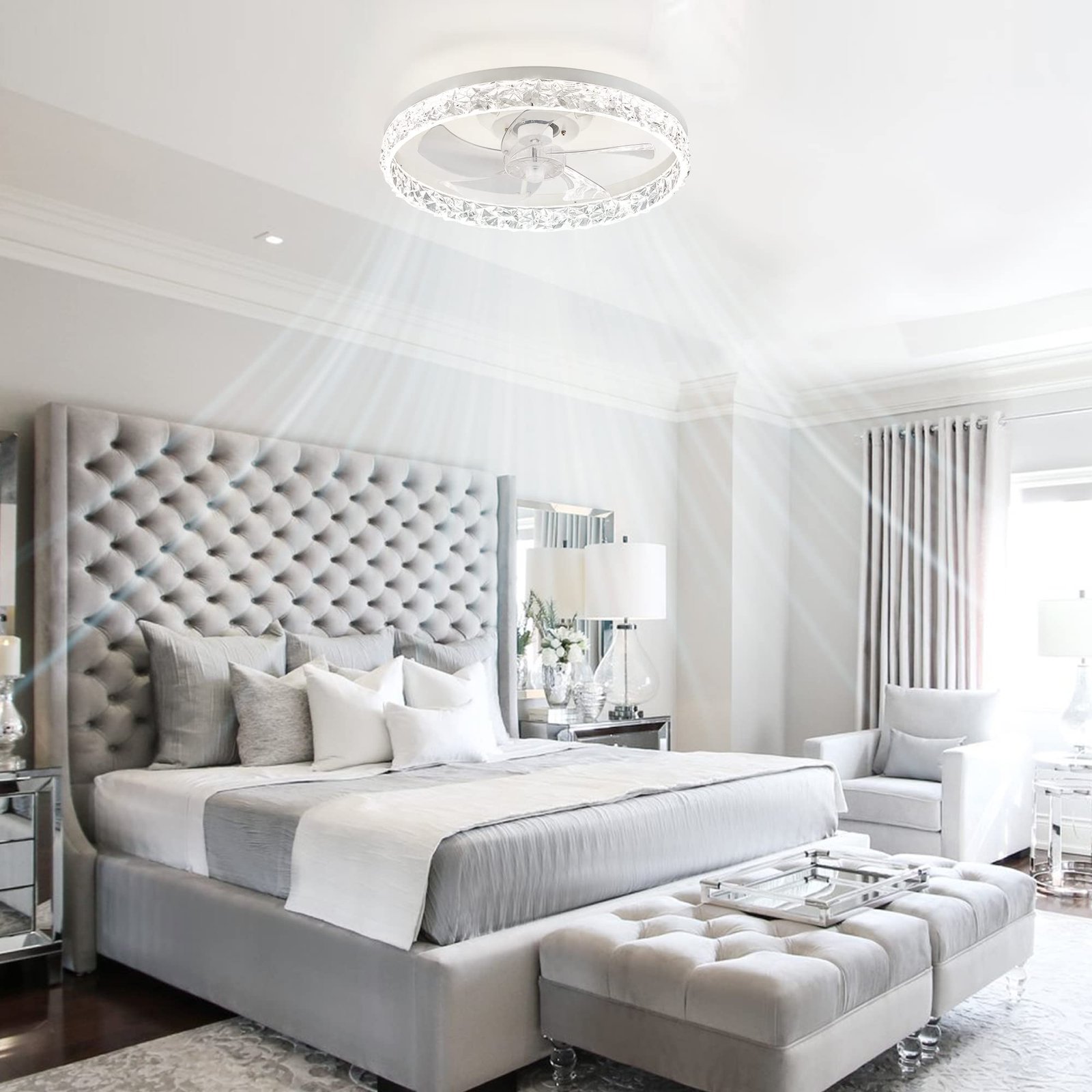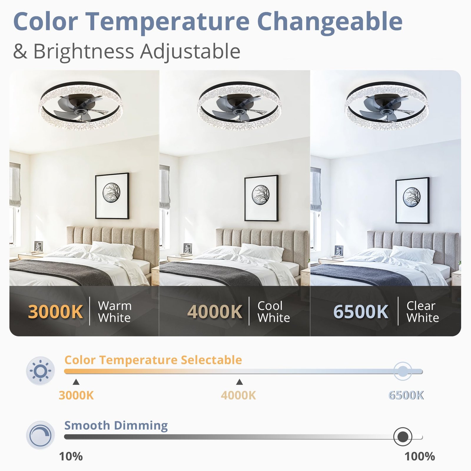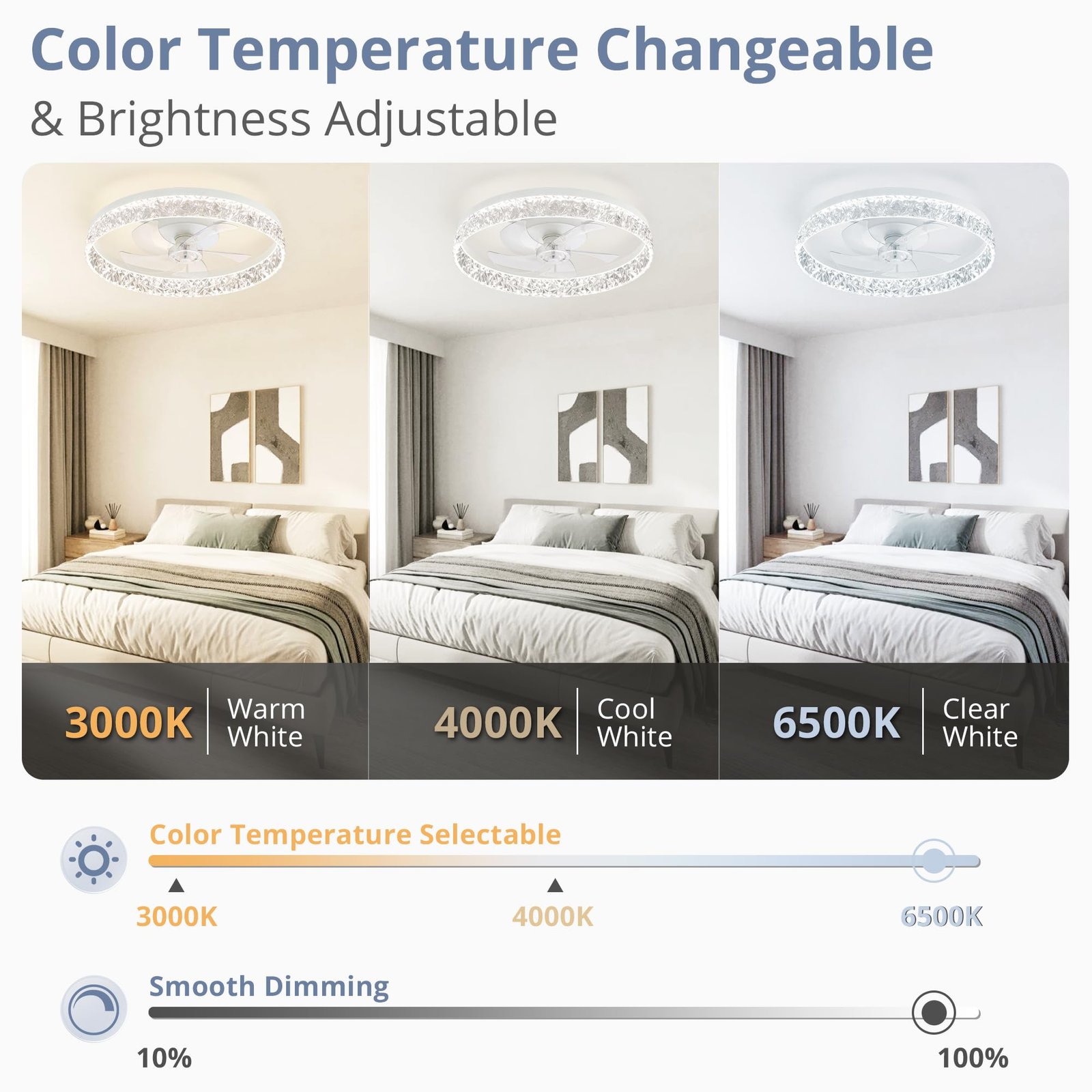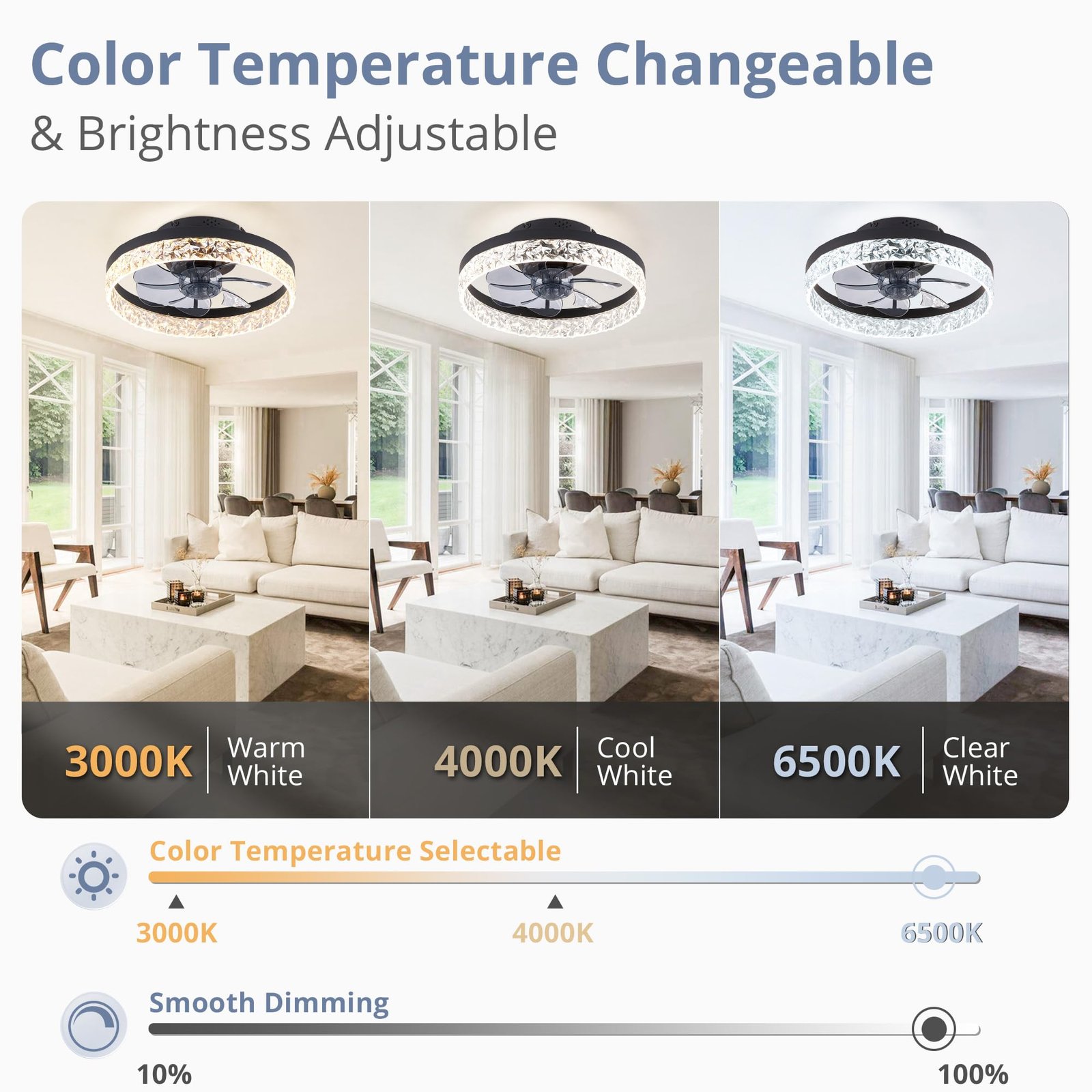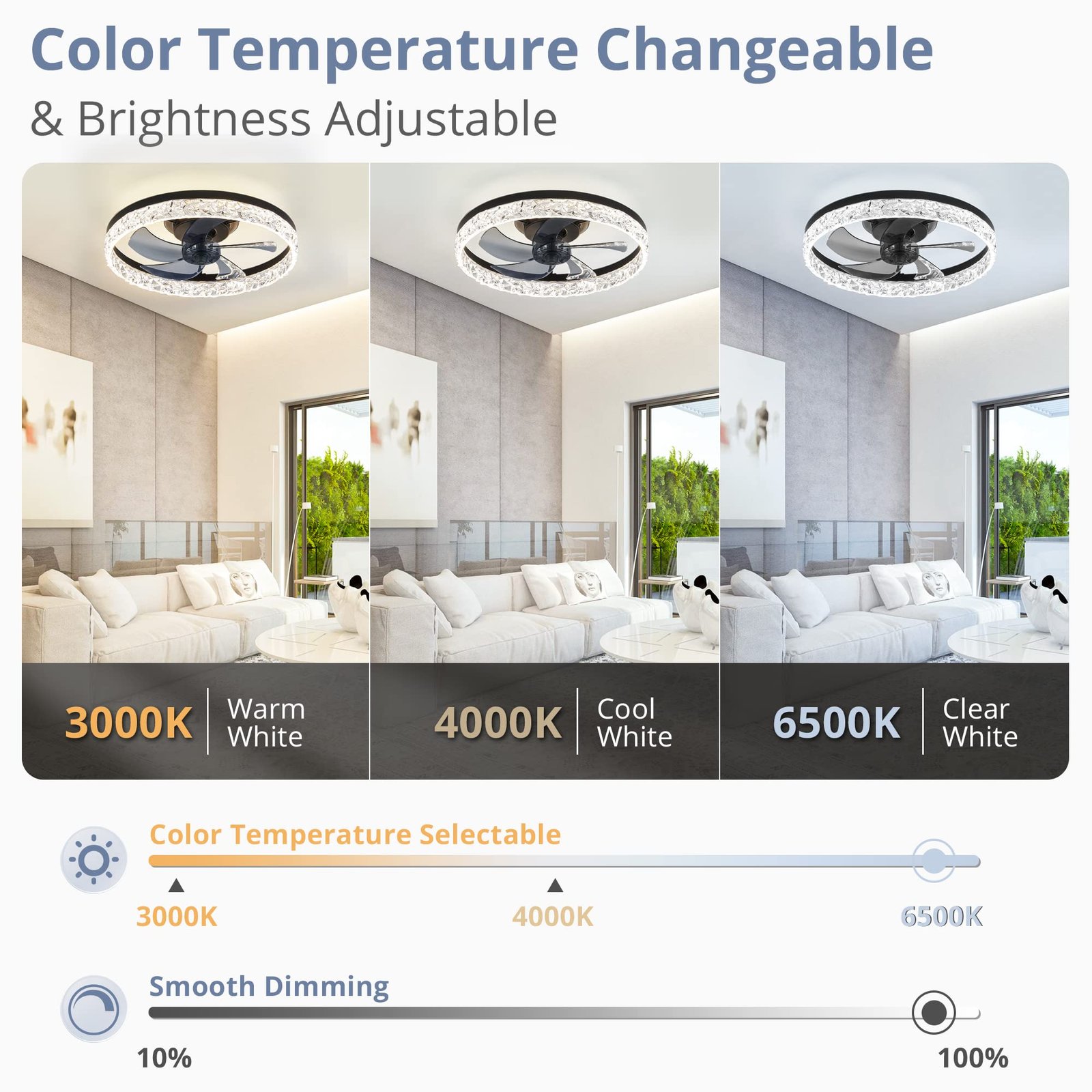 · Specification: Remote Control, 5 Blades, 3570 Lumens, 110 Voltage Output, Reversible Motor, 1/2H Timer Setting, 6 Speeds Fan, 3000K-6500K Color Temperature Selectable, 10%-100% Smooth Dimming