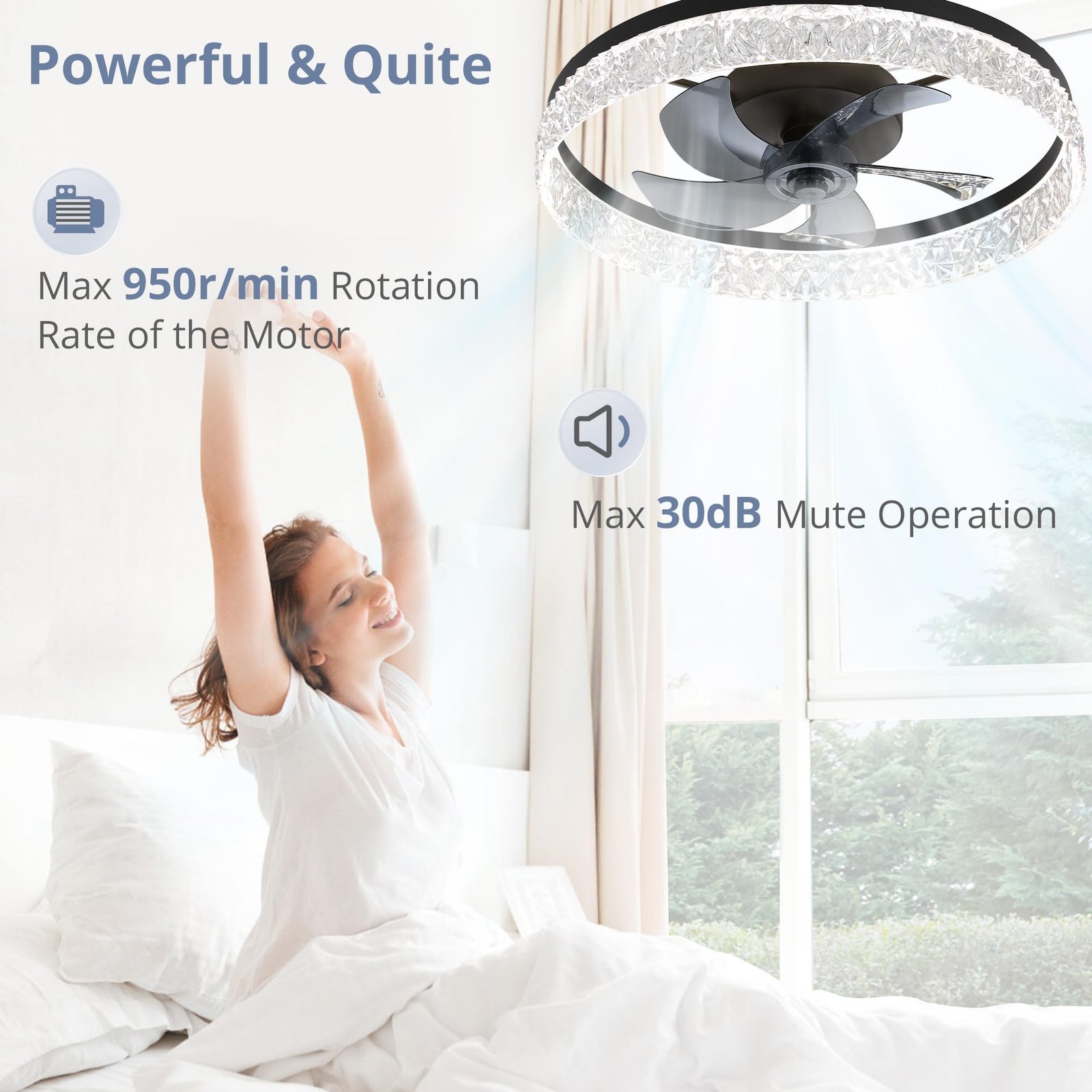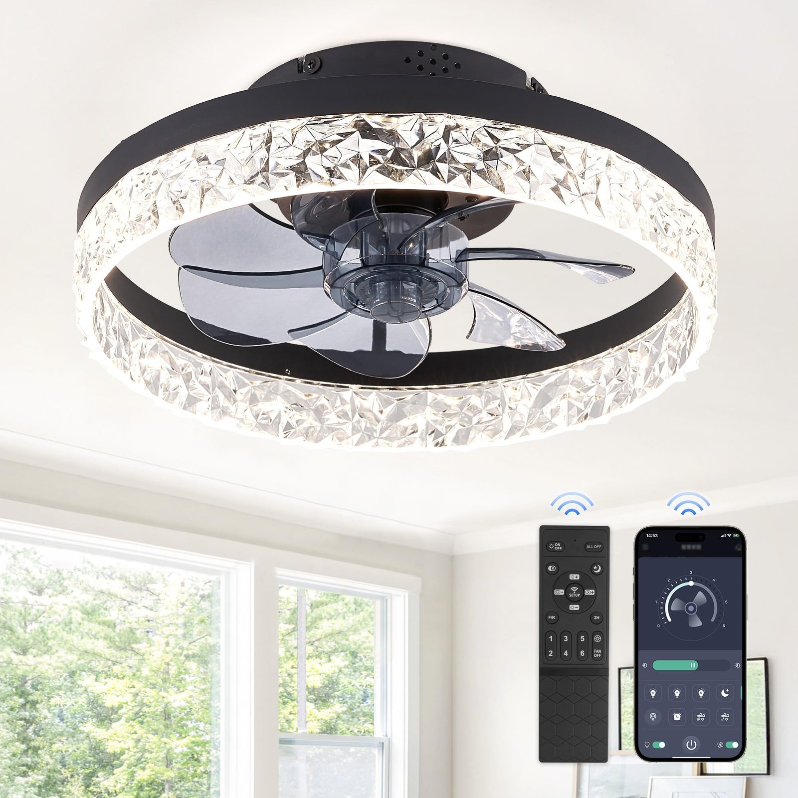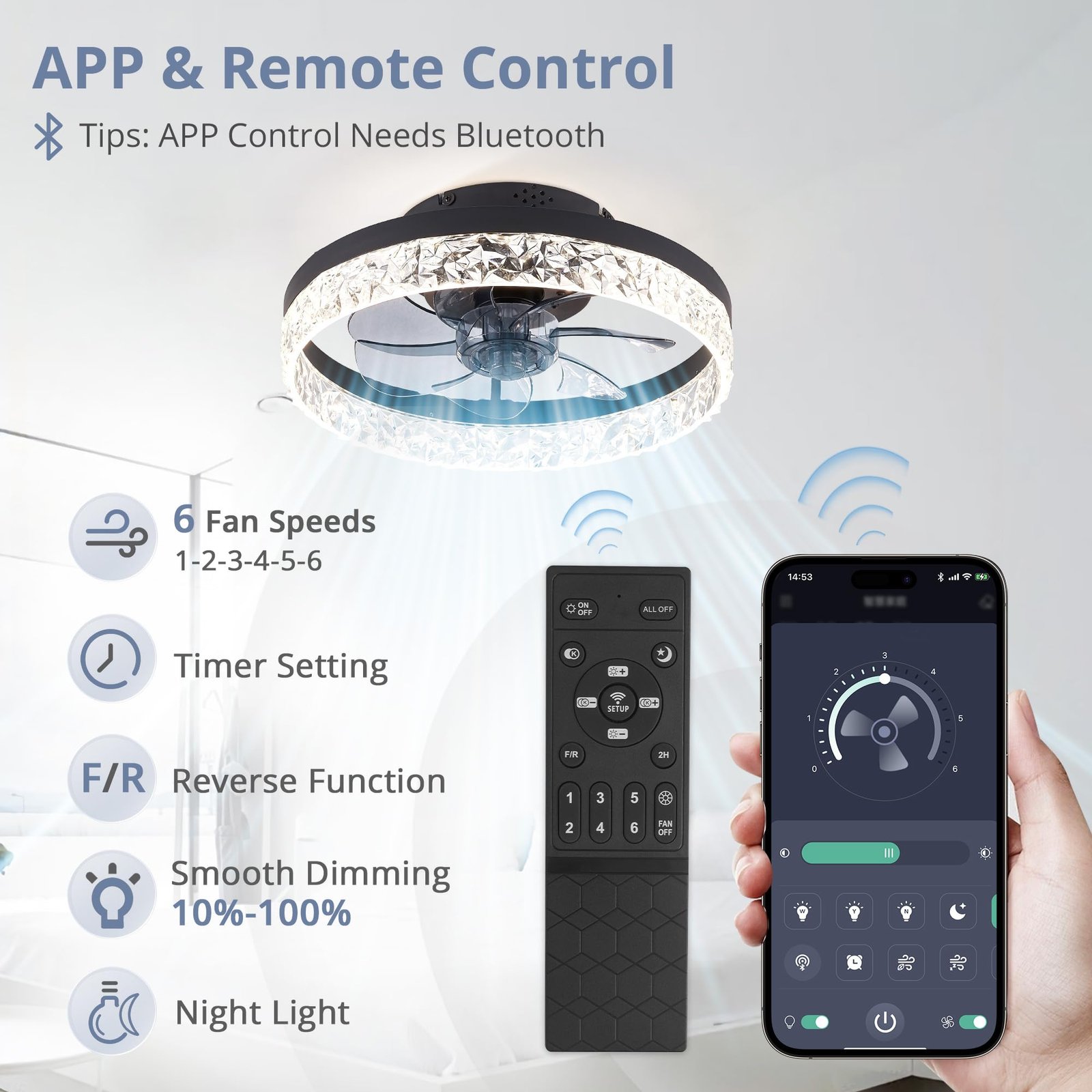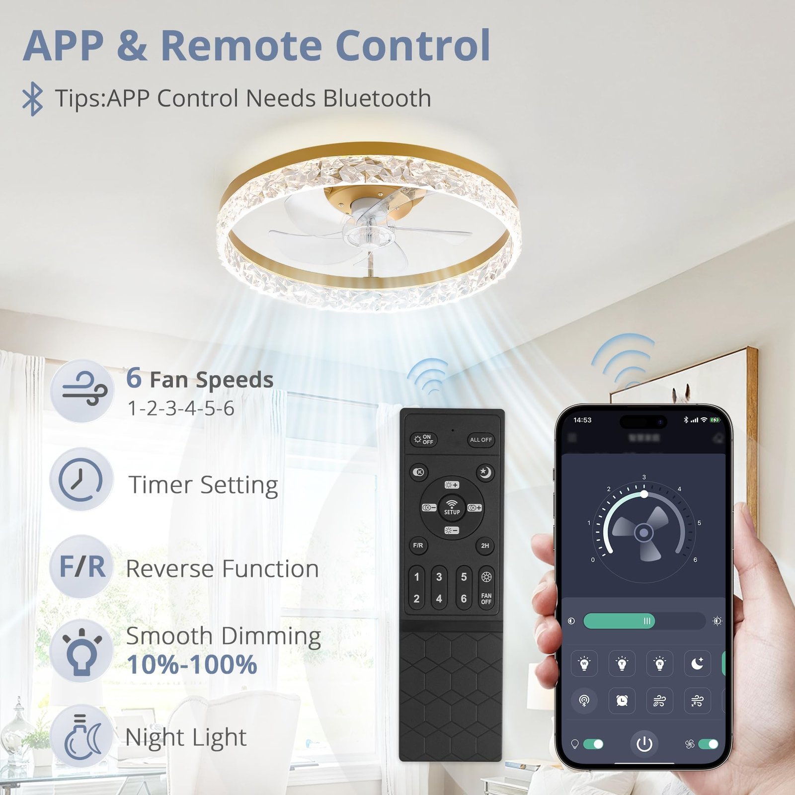· Remote Control & APP Control: This low profile ceiling fan with light has 6 speeds fan and sleep timer (2H) settings make it easy to maintain the ideal comfort level.The users can choose comfortable wind speed and light easily and conveniently through remote control. Tips:App control requires Bluetooth