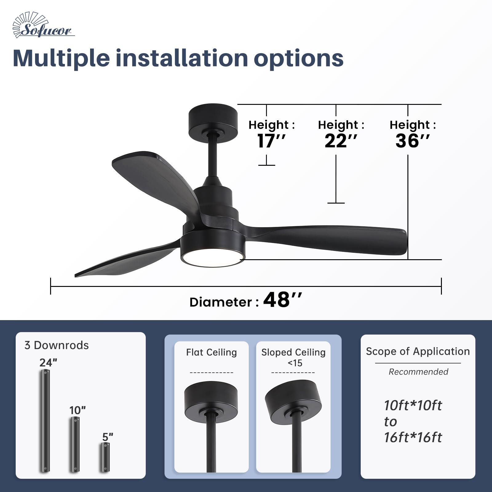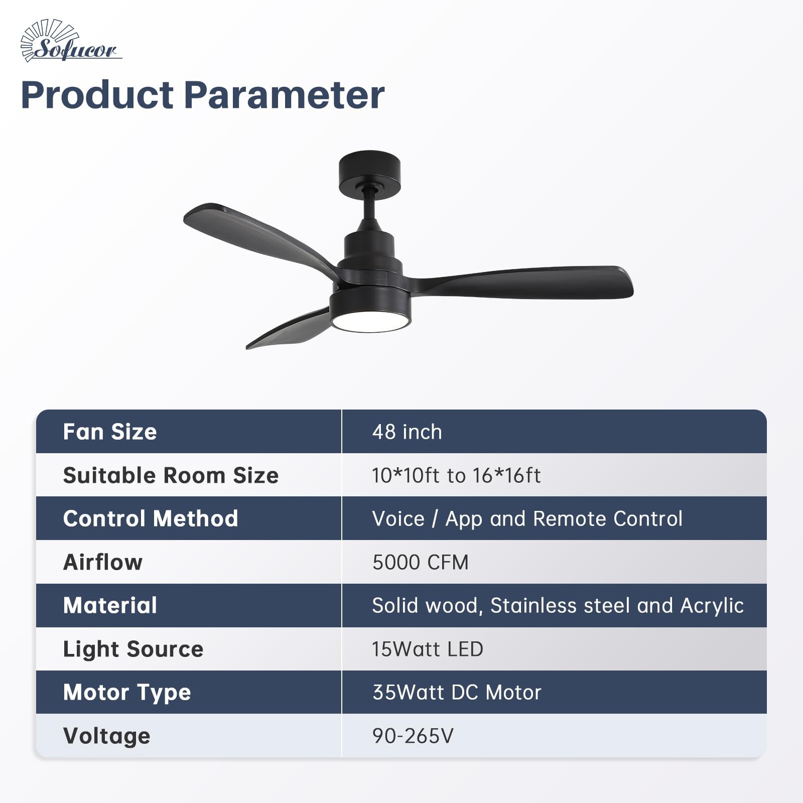 · 48 inch Smart Ceiling Fan with Light: Bring more than just wind and light, but comfort! Sofucor smart ceiling fan, with 3 Blade Solid Wood design, perfect decor your home while delivering enough airflow. Maximum applicable room size can be up to 18ft*18ft.