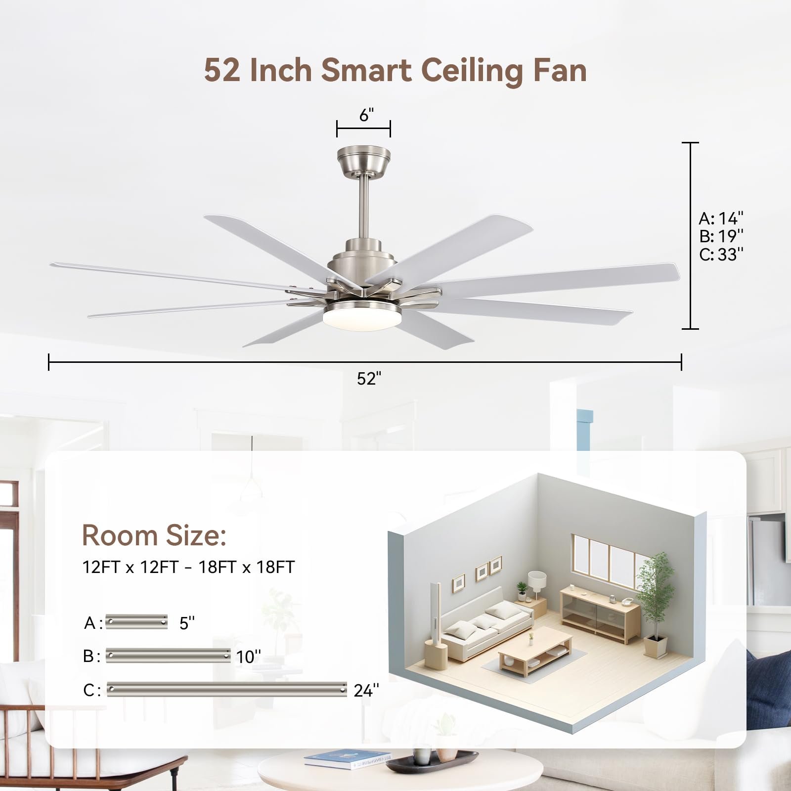 · Versatility Indoors & Outdoor Ceiling Fan – Engineered for universal adaptability, our ceiling fans with lights include three downrods (5″, 10″, 24″) and ±15° tilt capability to accommodate vaulted ceilings or low profiles. Damp-rated construction permits installation in covered patios, gazebos, and breezeways, while its refined aesthetic of ceiling fan enhances living rooms, kitchens, or home offices. (Note: Recommend rain-protected outdoor placement)
