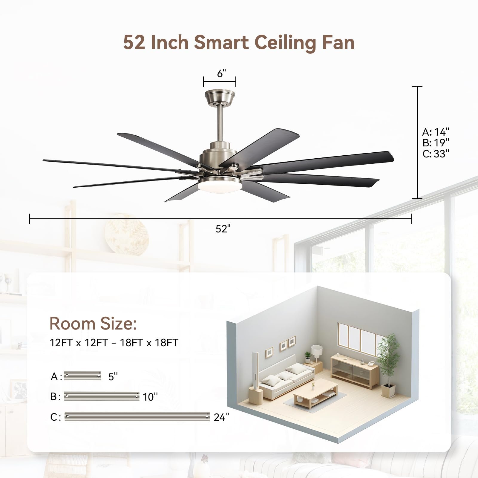 · Dynamic Climate Mastery – Sofucor 52 inch ceiling fans with high-efficiency DC motor, offering 6 precision-tuned wind modes – from sleep-friendly whispers to vigorous cooling gusts. Beyond summer comfort, the innovative reversal function solves winter’s “overhead heat trap” by recycling warm air downward, reducing heating costs by up to 10% while maintaining consistent warmth floor-to-ceiling.