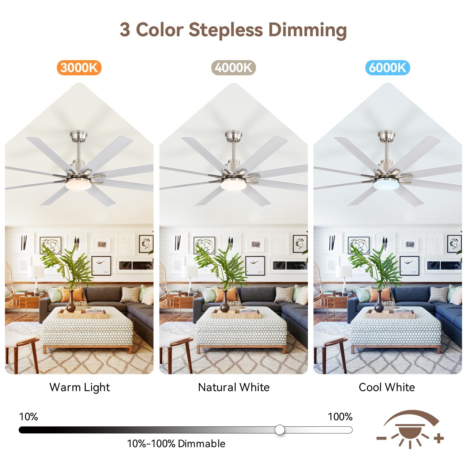 · Sophisticated Functionality & Seamlessly Integrated – A fusion of modern design and intelligent engineering. With striking 8-blade design, generate 6,500 CFM of powerful yet refined airflow, effortlessly circulating air through space up to 25x25ft. Paired with integrated LED, this ceiling fan transforms rooms into oases of adaptable comfort—whether casting a warm evening glow or delivering refreshing breezes on demand.