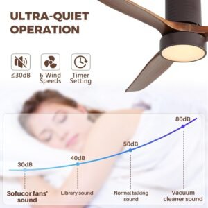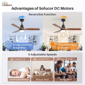 · Experience Year-Round Comfort – With Sofucor’s whisper-quiet, high-performance DC motor ceiling fan. Enjoy 6 precise speeds from gentle breeze to powerful cooling, while the smart reverse function solves winter’s ‘overhead heat pockets’ by pushing down warm air for even warmth, and delivers refreshing airflow in summer – all ensuring energy-efficient comfort.