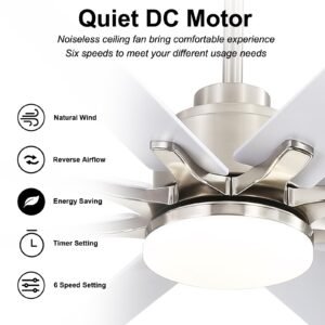 · Reversible DC Motor: Experience perfect airflow with our high-performance reversible DC motor. Choose from 6 speed settings – comfortable, natural, or strong breeze. Annoyed by trapped overhead heat in winter? The reversible function efficiently circulates warm air for consistent comfort. Quality airflow, year-round.