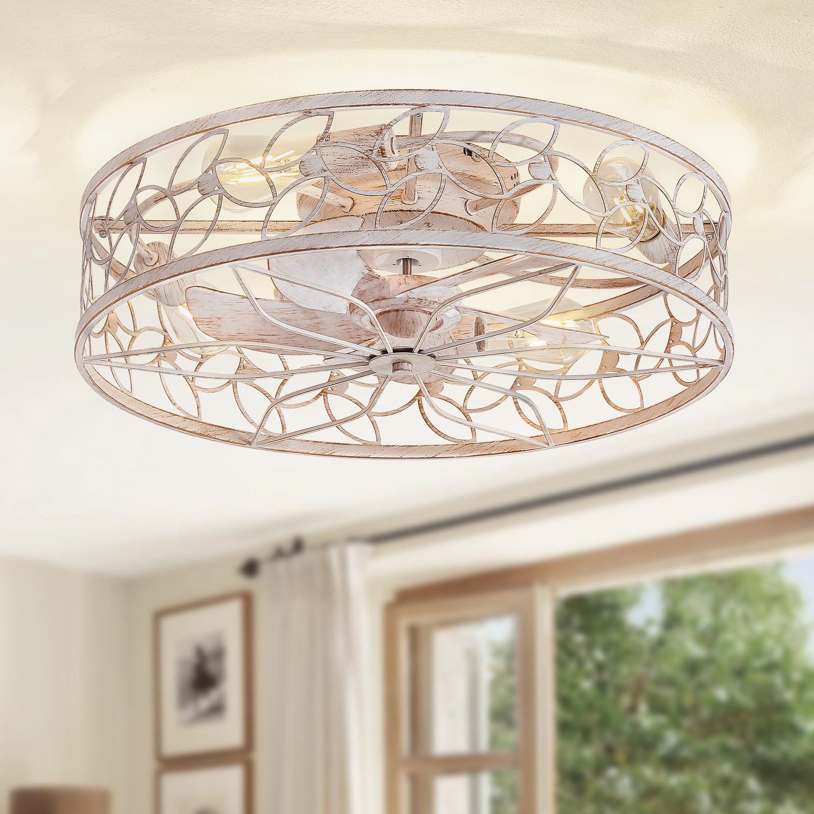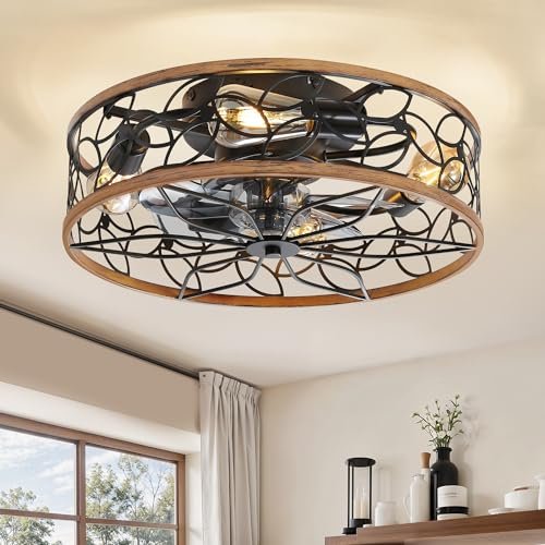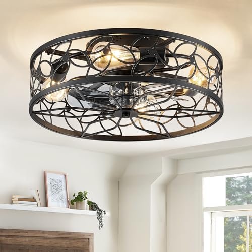 Caged Ceiling Fans with Lights, White Flush Mount Ceiling Fan with Remote