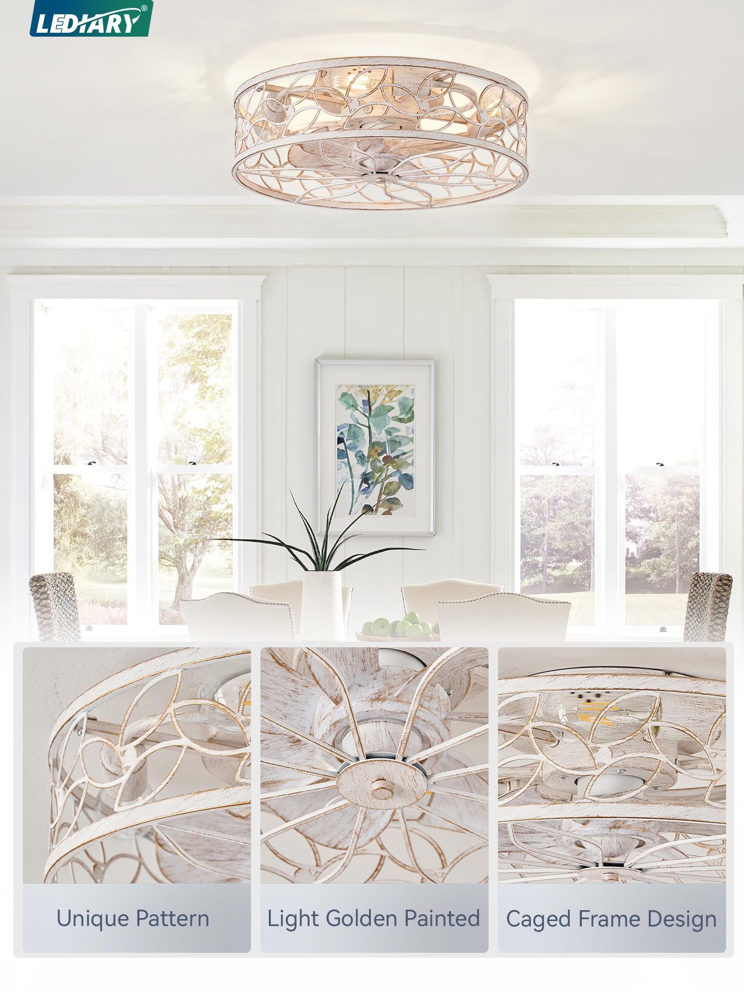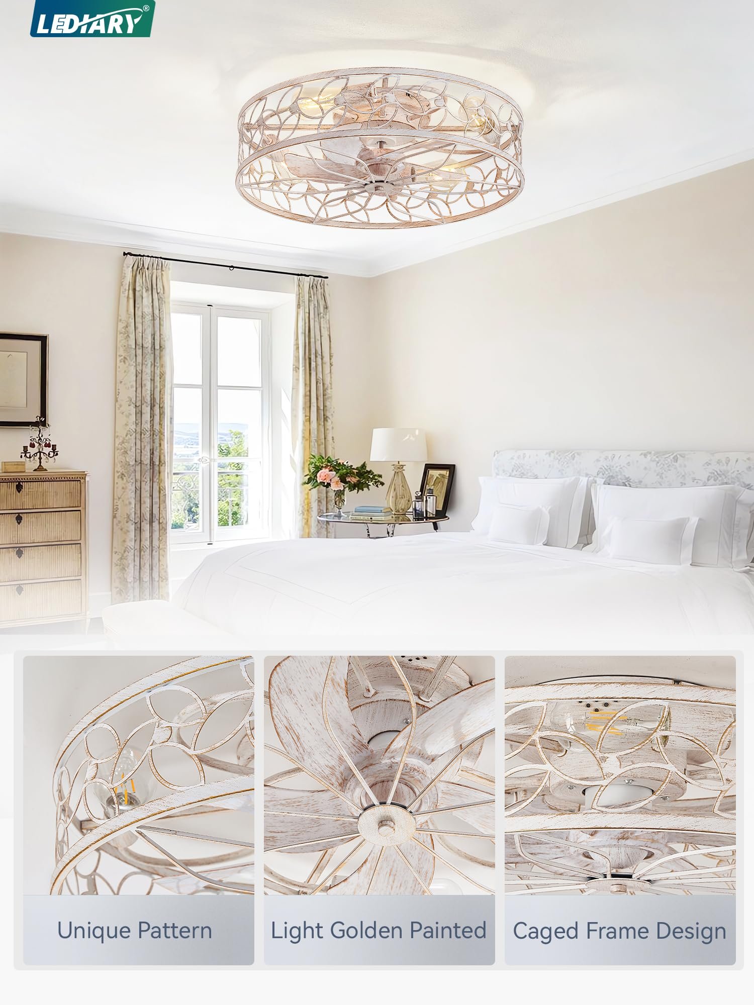 · 【Caged Design】The low profile ceiling fan has excellent coloring process and quality control, which combines practicality and aesthetics. It’s designed with the farmhouse and modern style——cage shaped frame, white and golden painted finish and lacelike pattern, perfectly matching and decorating your home.