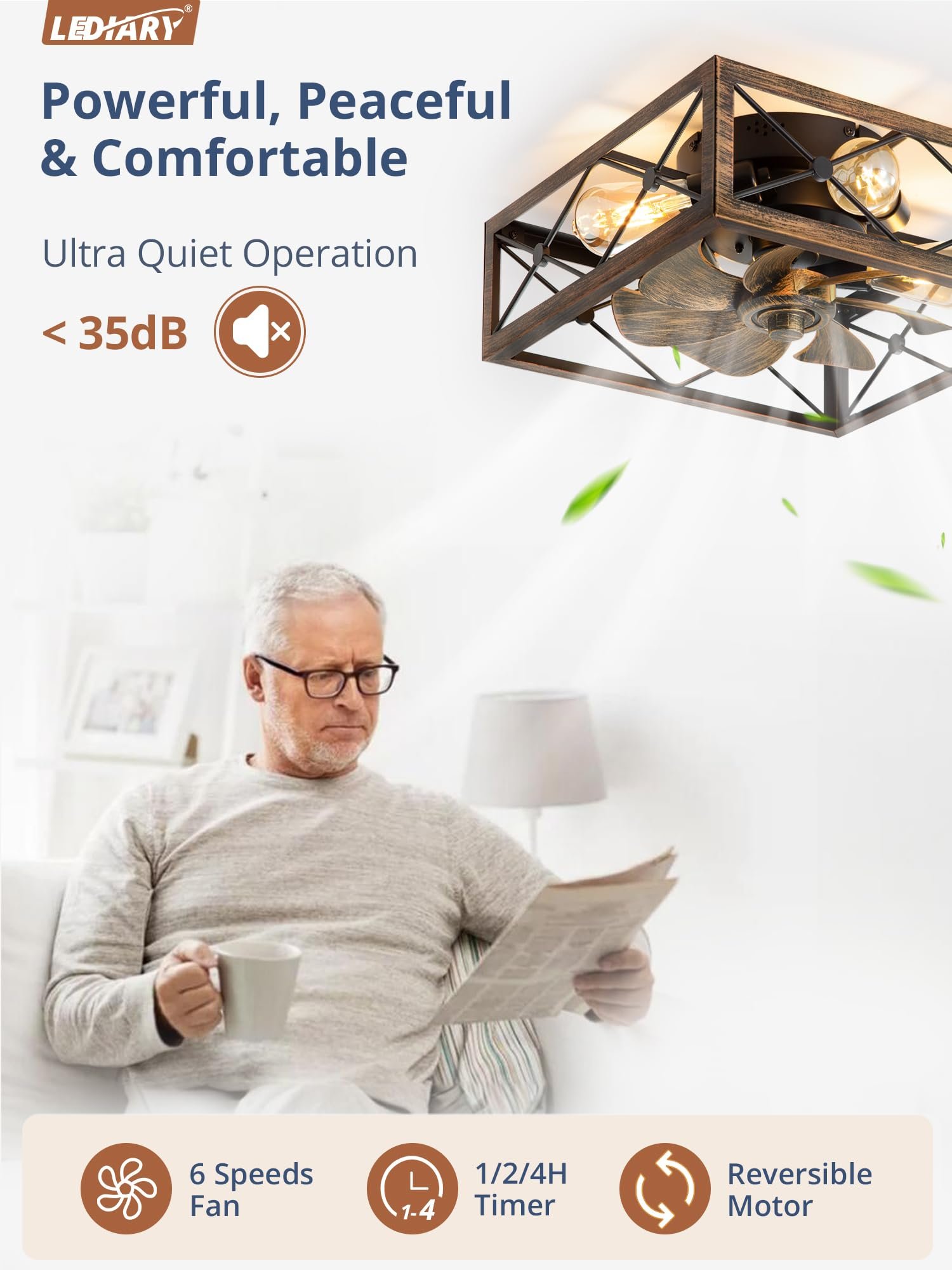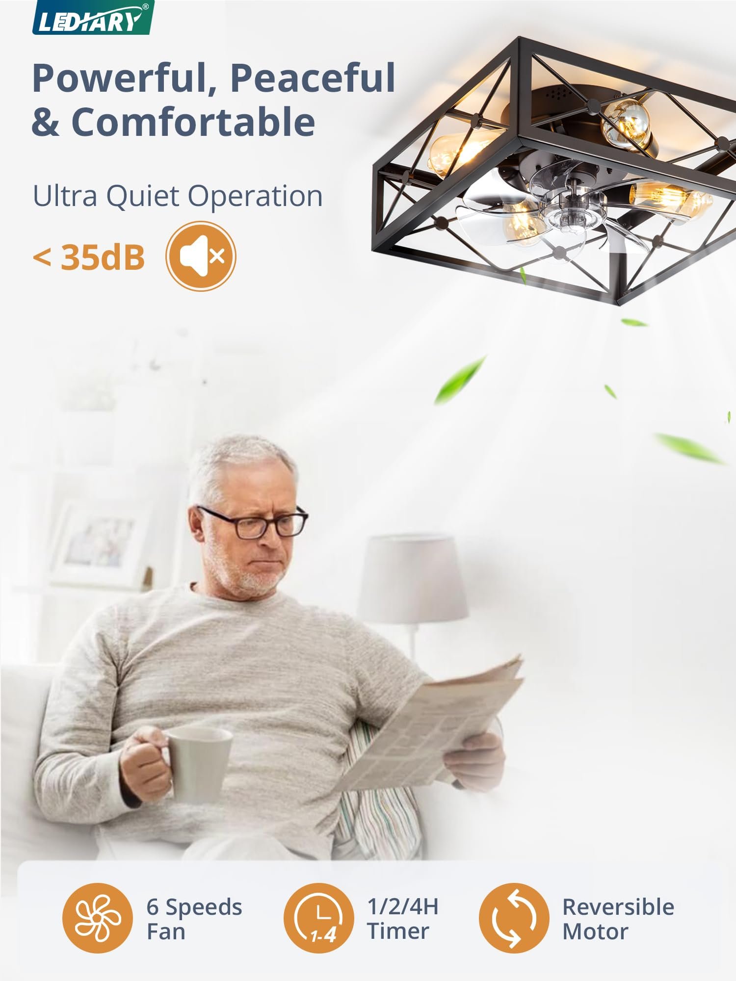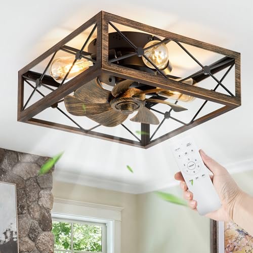 Caged Flush Mount Ceiling Fans with Lights and Remote, Black Square Low Profile Rustic Ceiling Fan