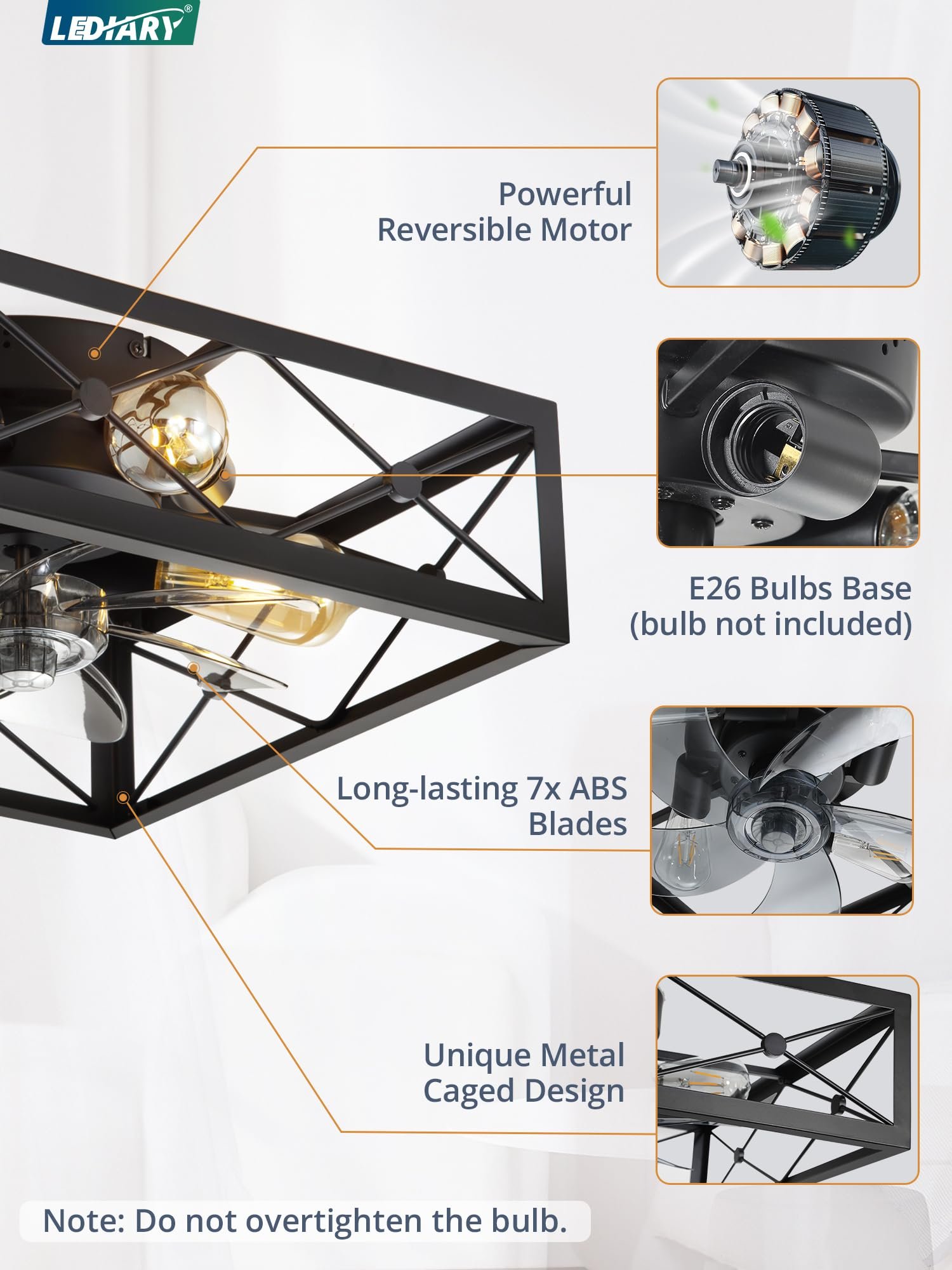 · Easy to Assemble: The caged ceiling fan features an upgraded structure and is easy to assemble and install. Simply follow the manual for self-installation—it takes around 15 minutes and can save you the cost of hiring an electrician.The black ceiling fan is compatible with E26 bulbs (bulbs not included). You’re free to choose light bulbs with your preferred color temperature and brightness to create the ambiance you want. (Note: Do not overtighten the bulb)
