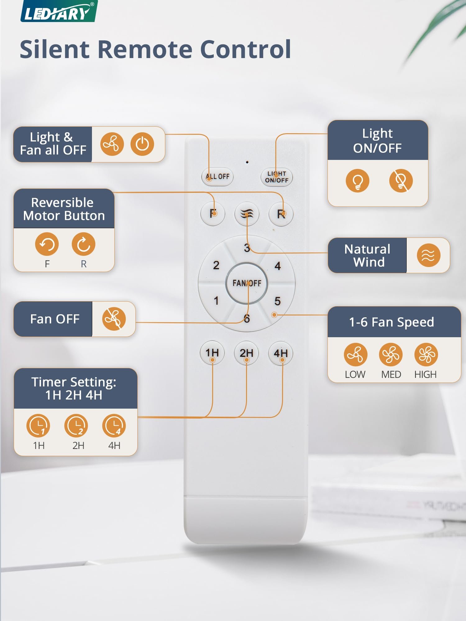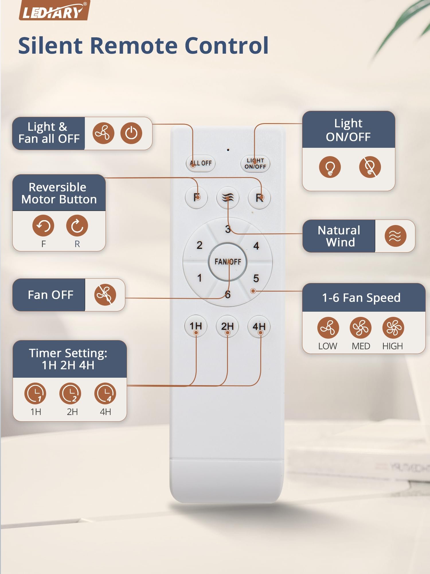 · Simple Remote Control: The silent Remote operates without any beeping, ensuring quiet convenience without disturbing your family. Easily handle 5 key features with the remote: 6 wind speeds, reversible mode, 1/2/4-hour timer, natural wind mode and control the fan or light separately, provides remarkable convenience