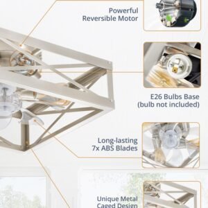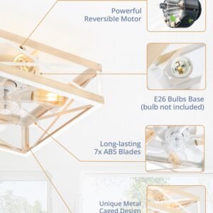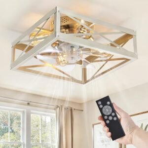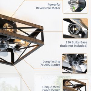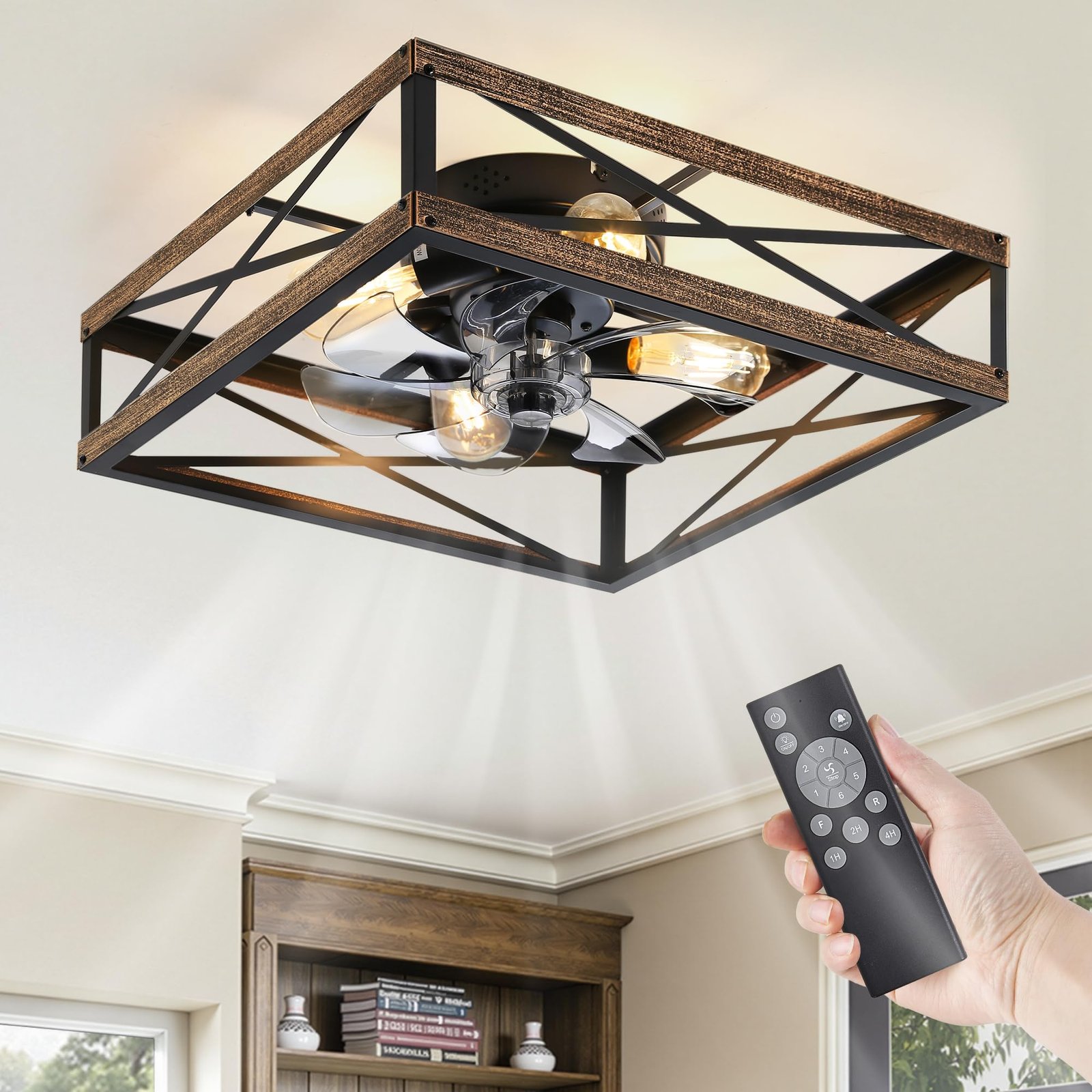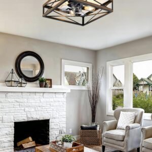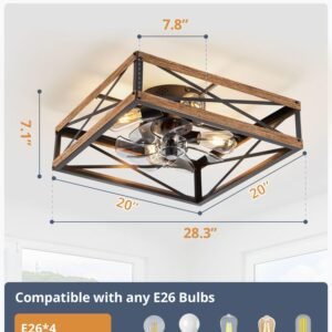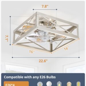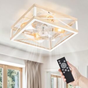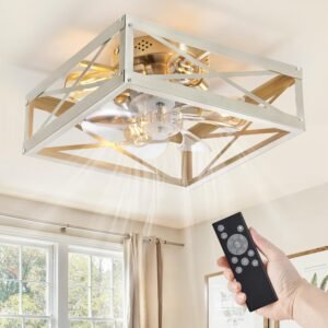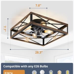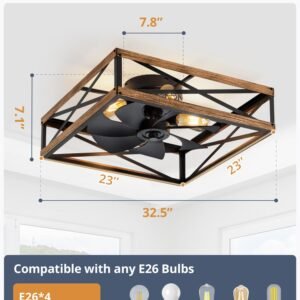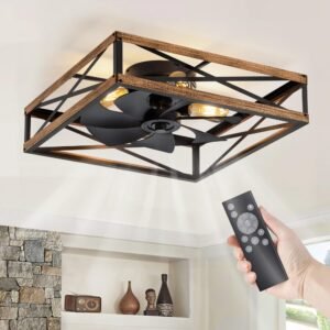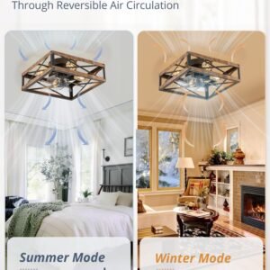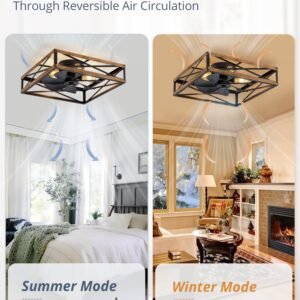 Caged Low Profile Ceiling Fans with Lights and Remote, Rustic Square Flush Mount Ceiling Fan