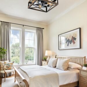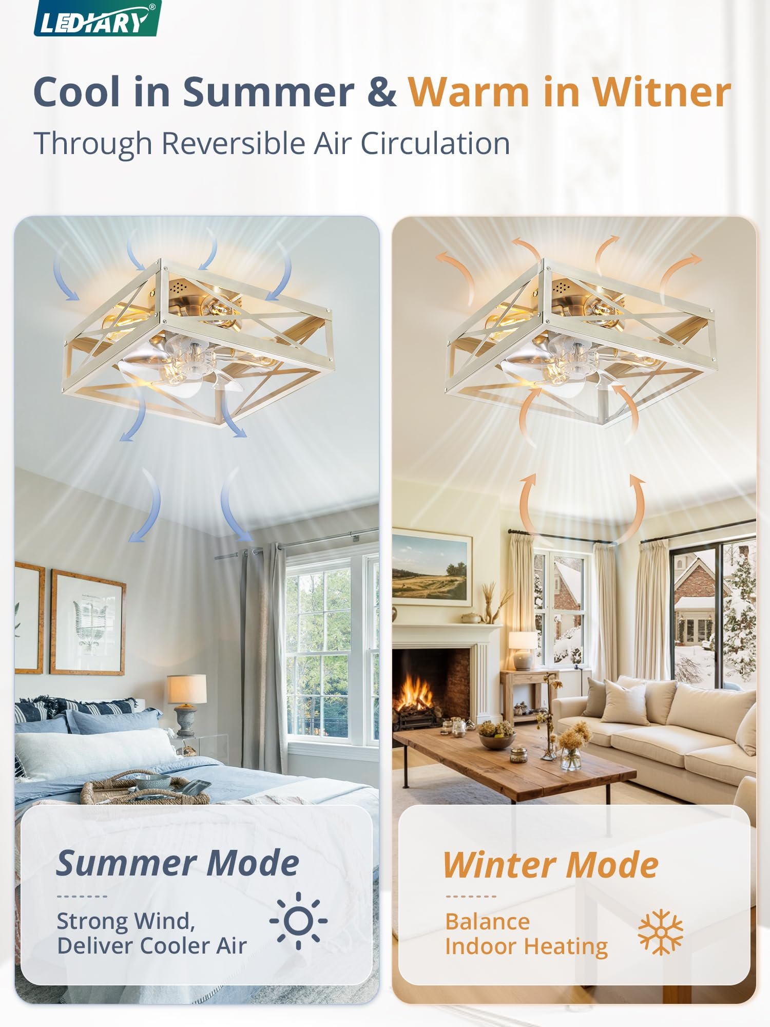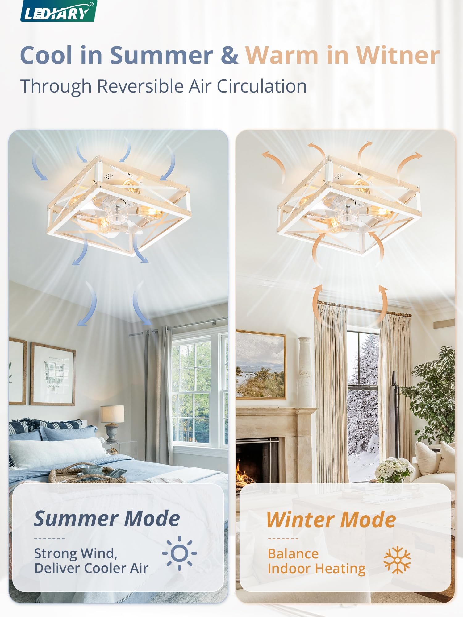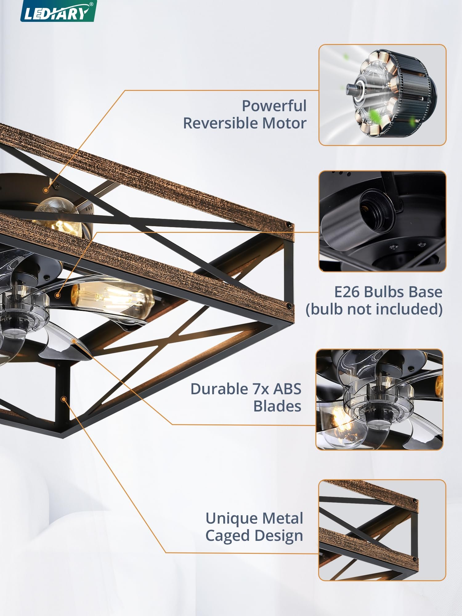 · Square Caged Design: The farmhouse ceiling fan boasts a unique square wood grain color cage design, and the intersecting pattern on the cage adds an artistic touch to this caged ceiling fan. The small ceiling fan fits well in most spaces, complementing bedrooms, kitchen and living rooms perfectly, bringing a rich blend of industrial and rustic styles to your home decor