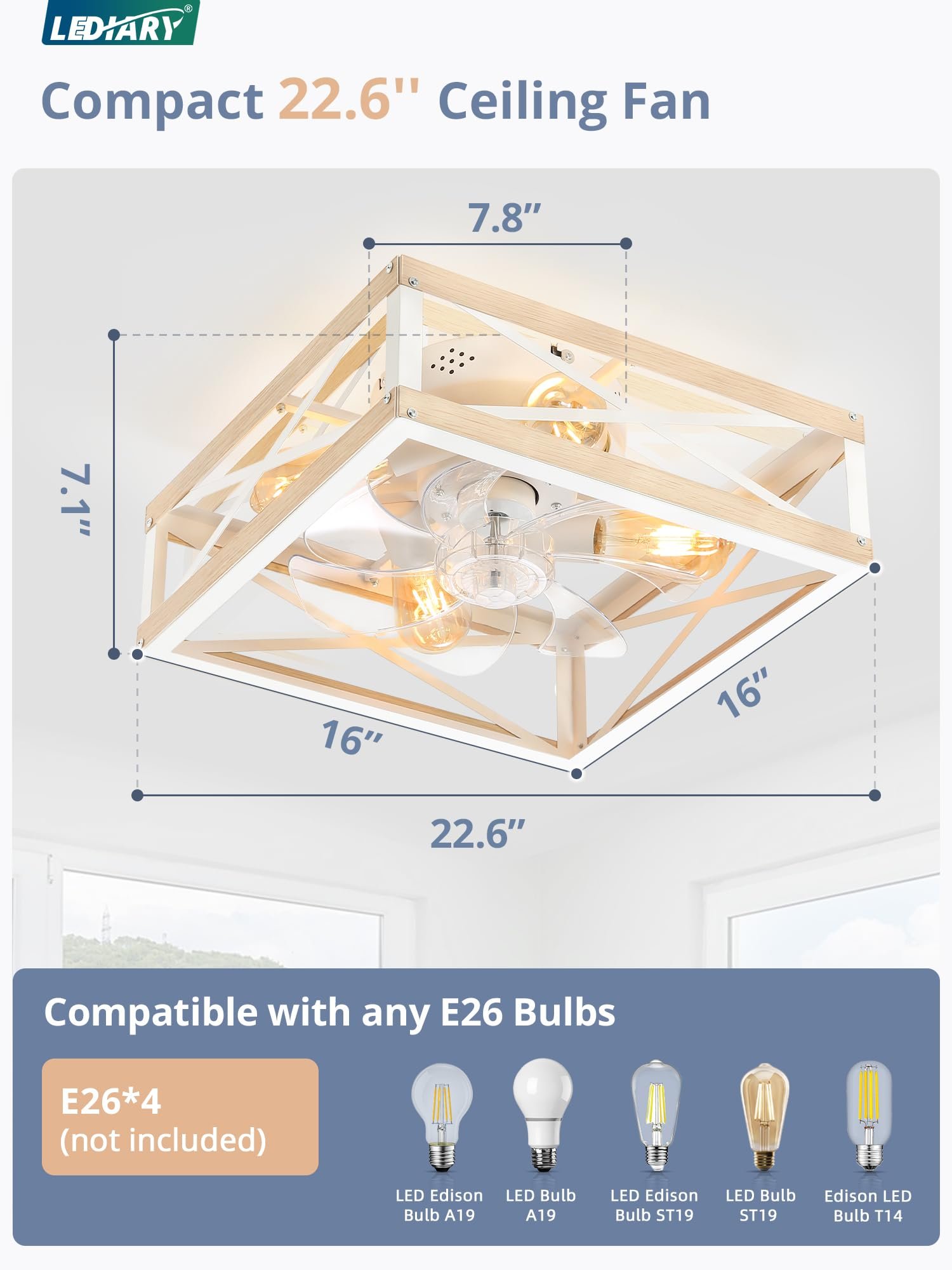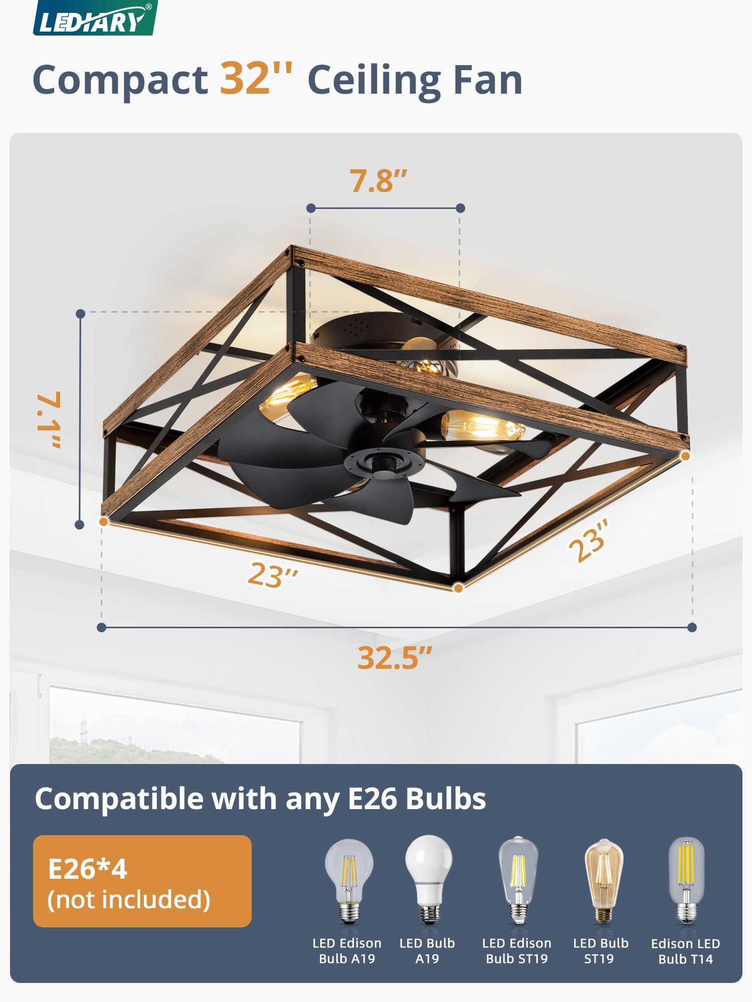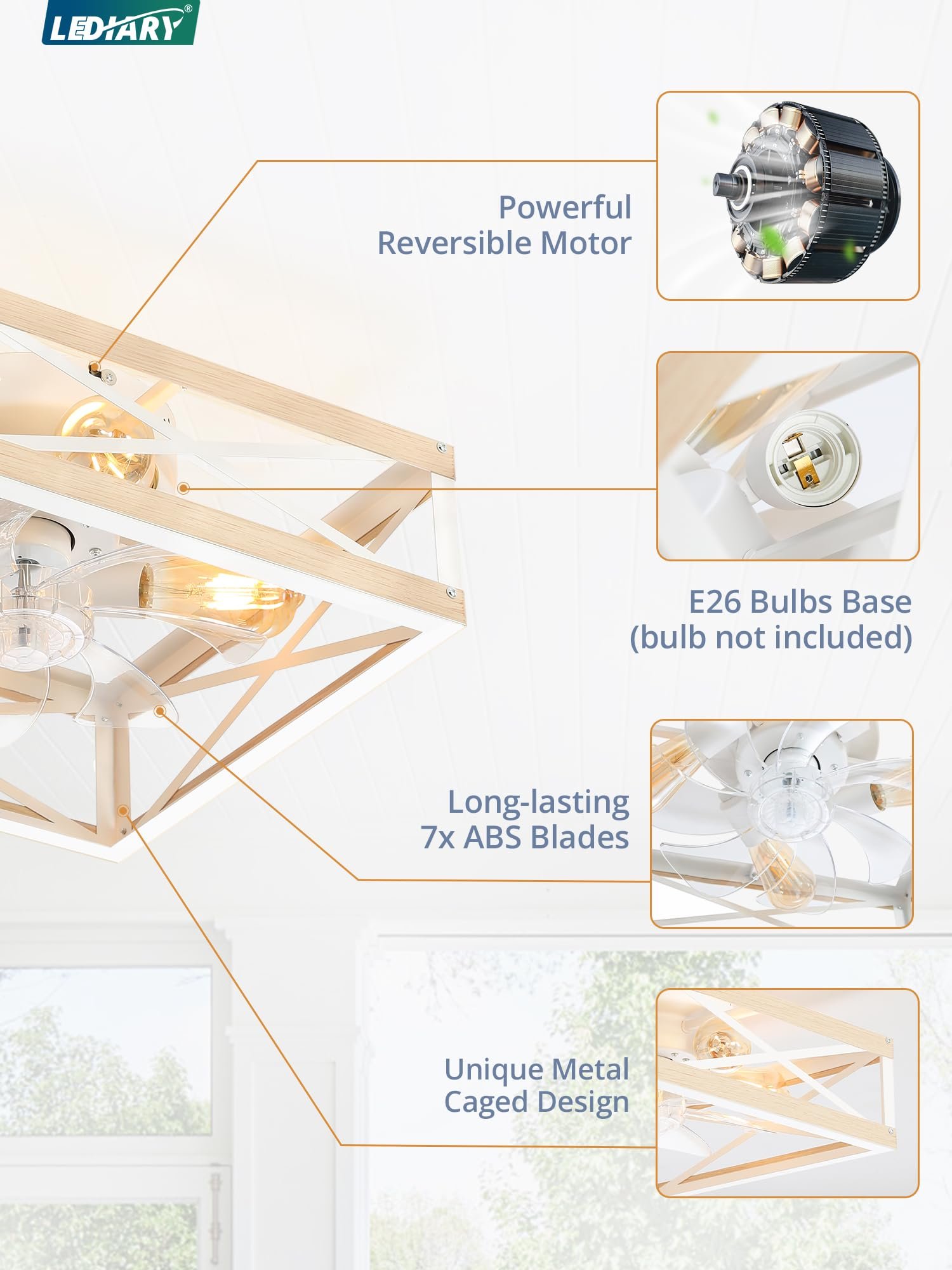 · Easy to Assemble: The components of the caged ceiling fan are pre-assembled, you just need to mount it onto the ceiling. Refer to the details page or manual for self-installation, it takes less than 5 minutes, saving you from additional expenses for an electrician. The enclosed ceiling fan is compatible with E26 bulbs (Bulbs not included). You are free to choose any light bulb with a different color temperature or brightness to create the ambiance you want