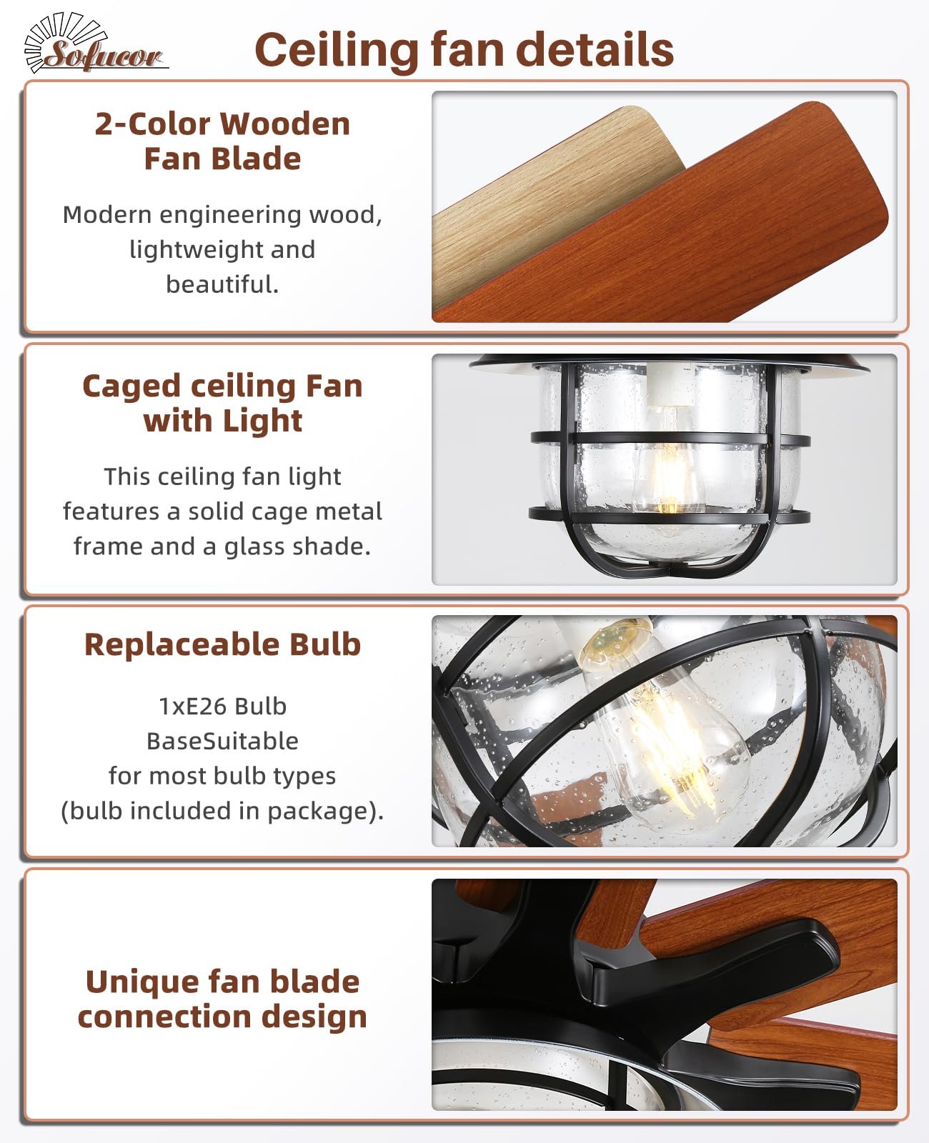 · Easy Installation & Lifetime Motor Maintenance – Easy self-installation with detailed guides & videos. 24/7 tech support included! Sofucor’s ceiling fans are ETL/FCC certified, featuring a lifetime motor warranty and 3-year protection. Choose us for quality and reliability.