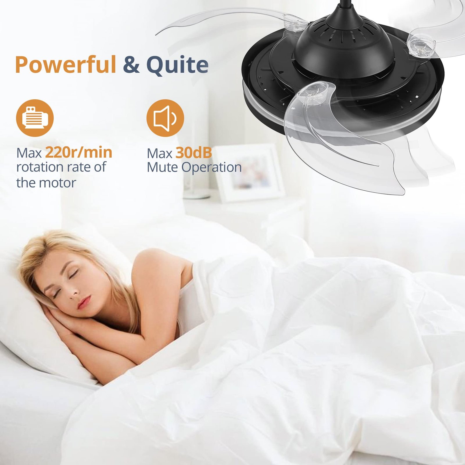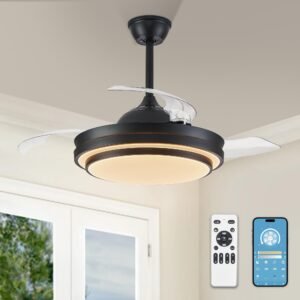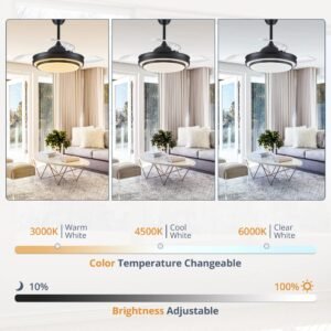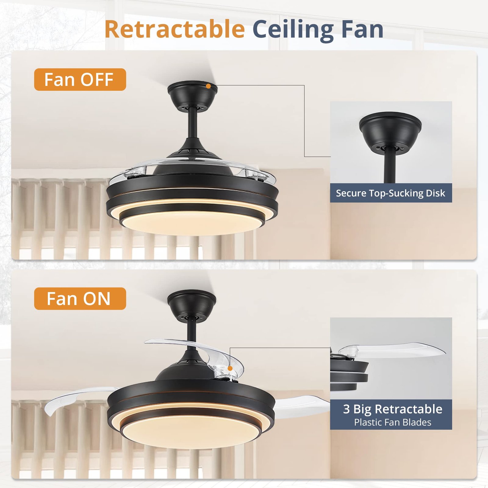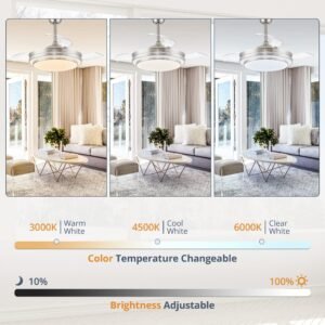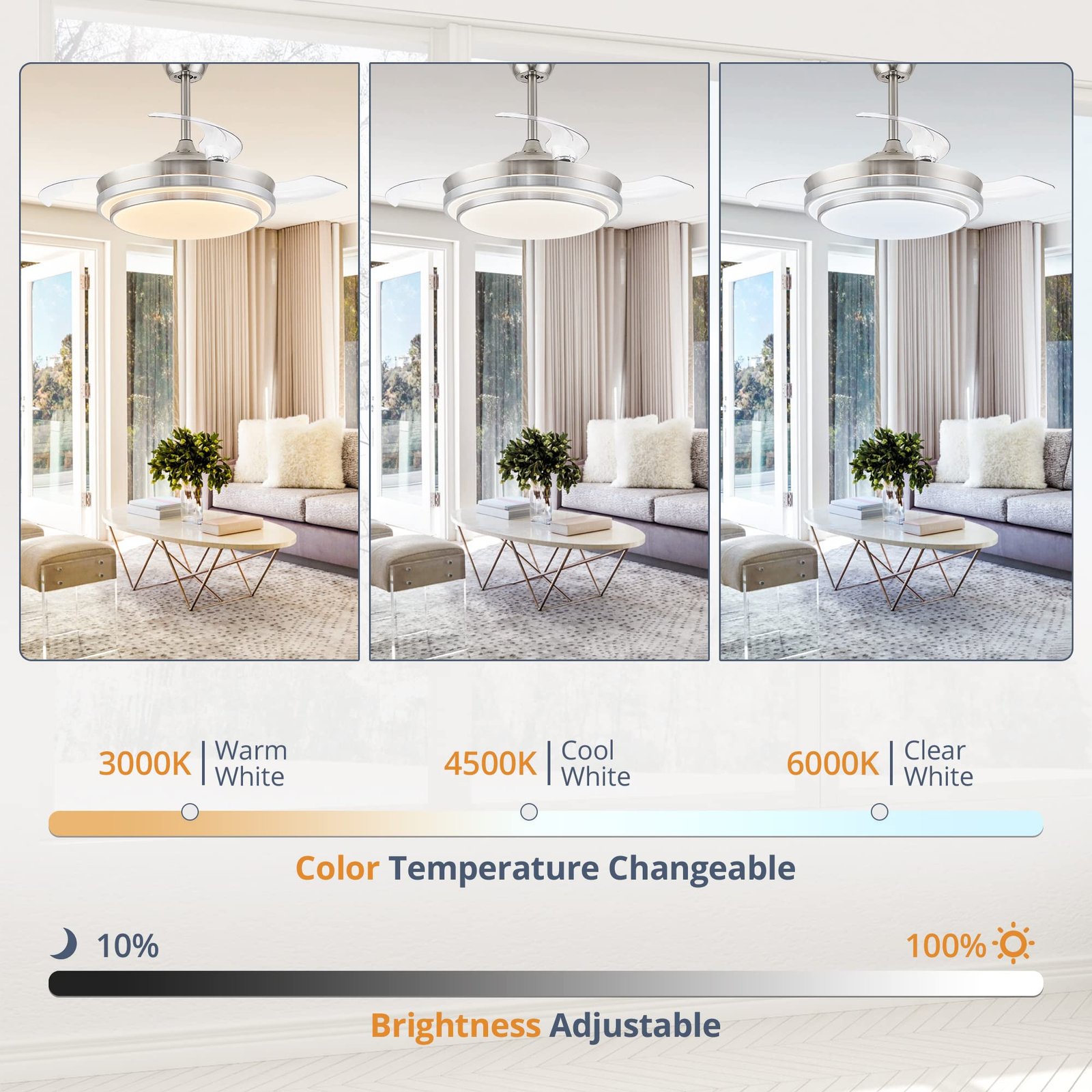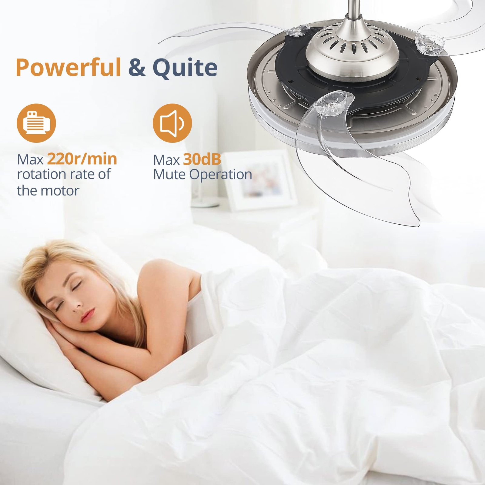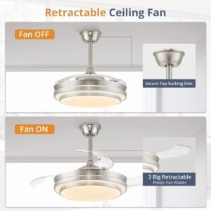 · Reversible Motor & 42 Inch Retractable Blades:Our retractable ceiling fan can be used in summer and winter modes, promoting air circulation and saving energy. This retractable ceiling fan comes with a brushed nickel body and 42 Inch transparent blades